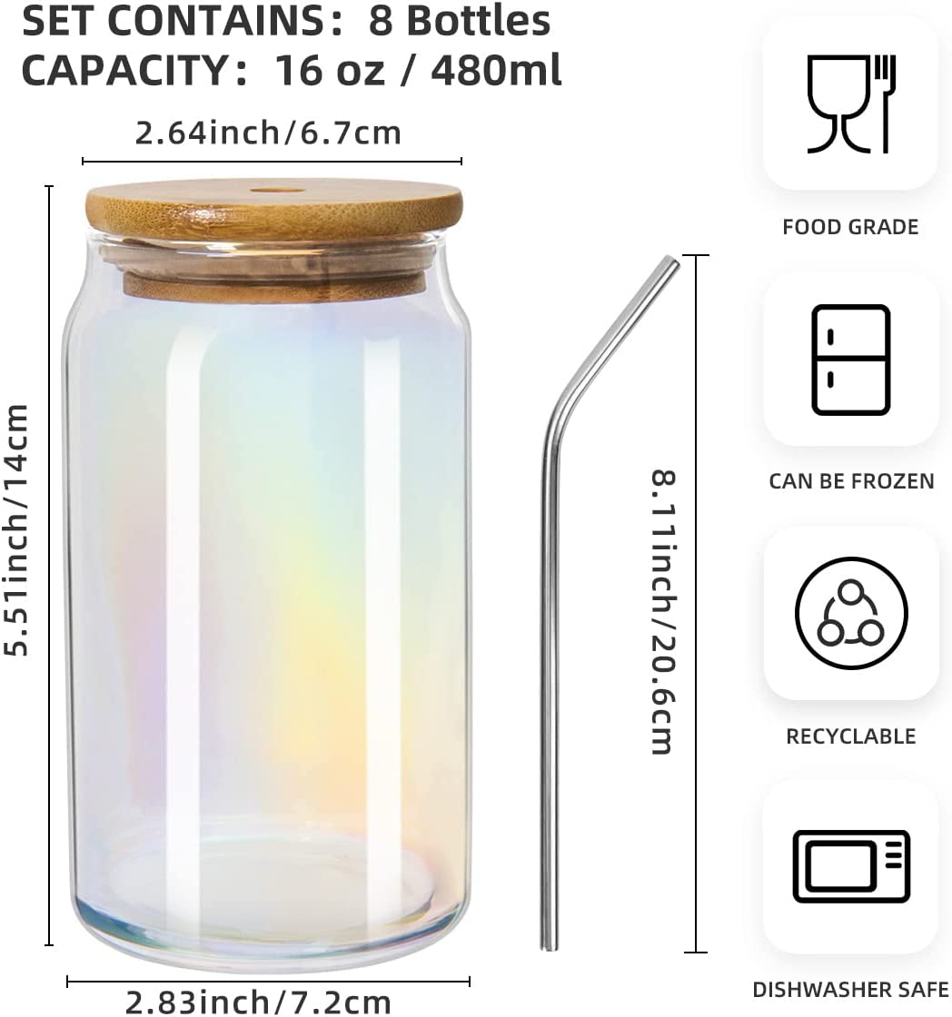 8 Pack Beer Glasses:Juice bottle set includes 8 beer can glasses, 8 nature bamboo lids, 8 stainless steel straws, 1 bottle brush and 1 straw brush.They are all dishwasher safe and refrigerator safe.
