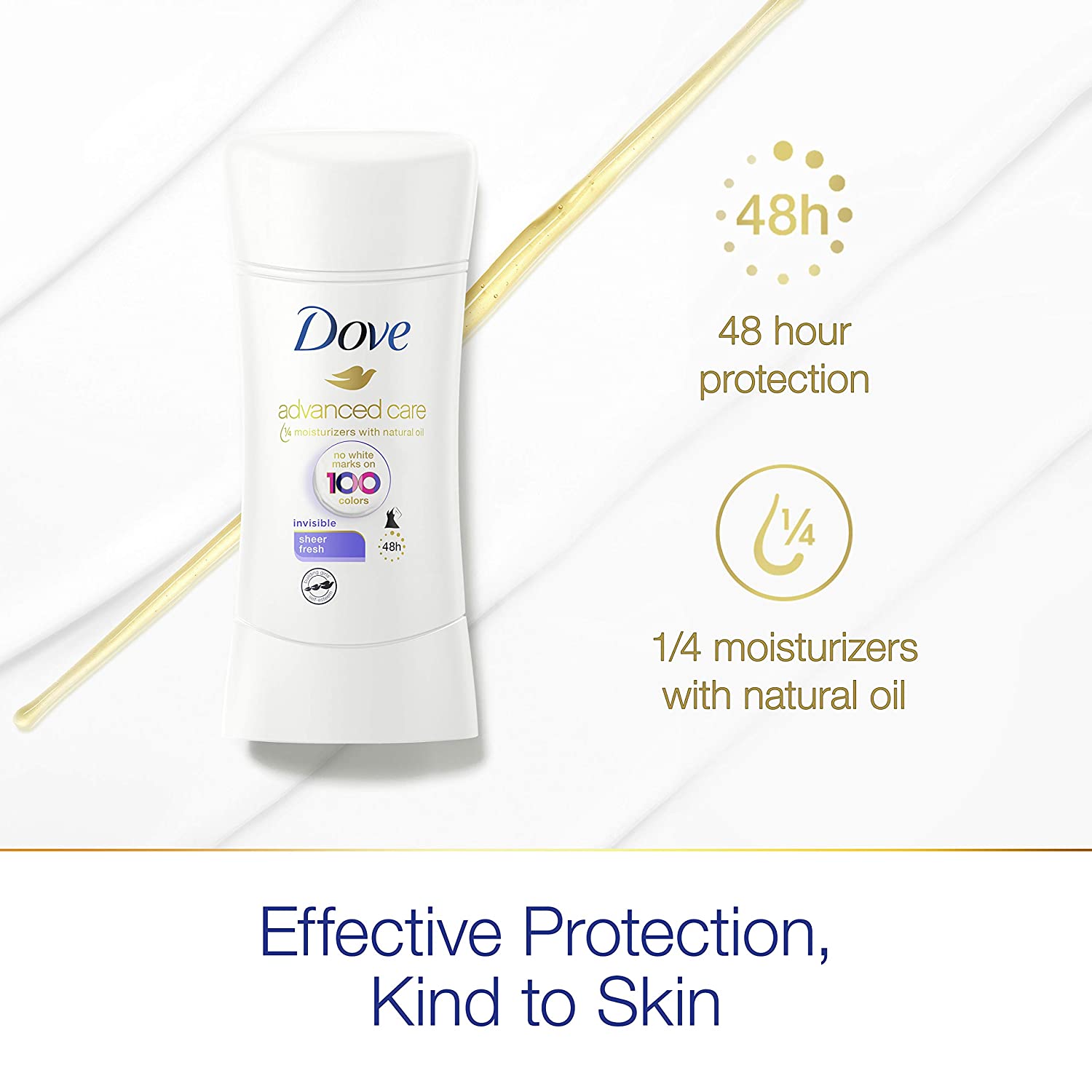 With Dove Advanced Care Invisible Sheer Fresh Antiperspirant Deodorant Stick, you can step out in style. This antiperspirant deodorant for women is proven to be invisible on 100 colors of clothing. Giving you long-lasting protection against underarm sweat and odor, this non-irritating antiperspirant for women will leave your underarms feeling healthy and protected for up to 48 hours. Enriched with our signature 1/4 moisturizers with natural oil, this antiperspirant gives you a dose of underarm care. Its 0 percent alcohol (ethanol) formula helps reduce irritation from shaving and leaves you with the fresh scent of cucumber with notes of freesias, lily and rose. Use Dove women's deodorant regularly and you can enjoy beautifully soft and comfortable underarms that stay dry all day long. For best results, swipe your antiperspirant deodorant stick up and down each underarm until an even layer is applied. Apply this Dove antiperspirant deodorant to dry skin after showering and enjoy fresh, comfortably dry skin from morning to night. Dove is certified cruelty-free by PETA because we believe that real beauty is cruelty-free. We’re on a mission to help women raise their self-esteem – because we believe beauty should be a source of confidence, not anxiety. Dove Antiperspirant Deodorants deliver effective underarm protection and are kind to skin, so women can be free of underarm inhibitions and live beautifully unselfconsciously.