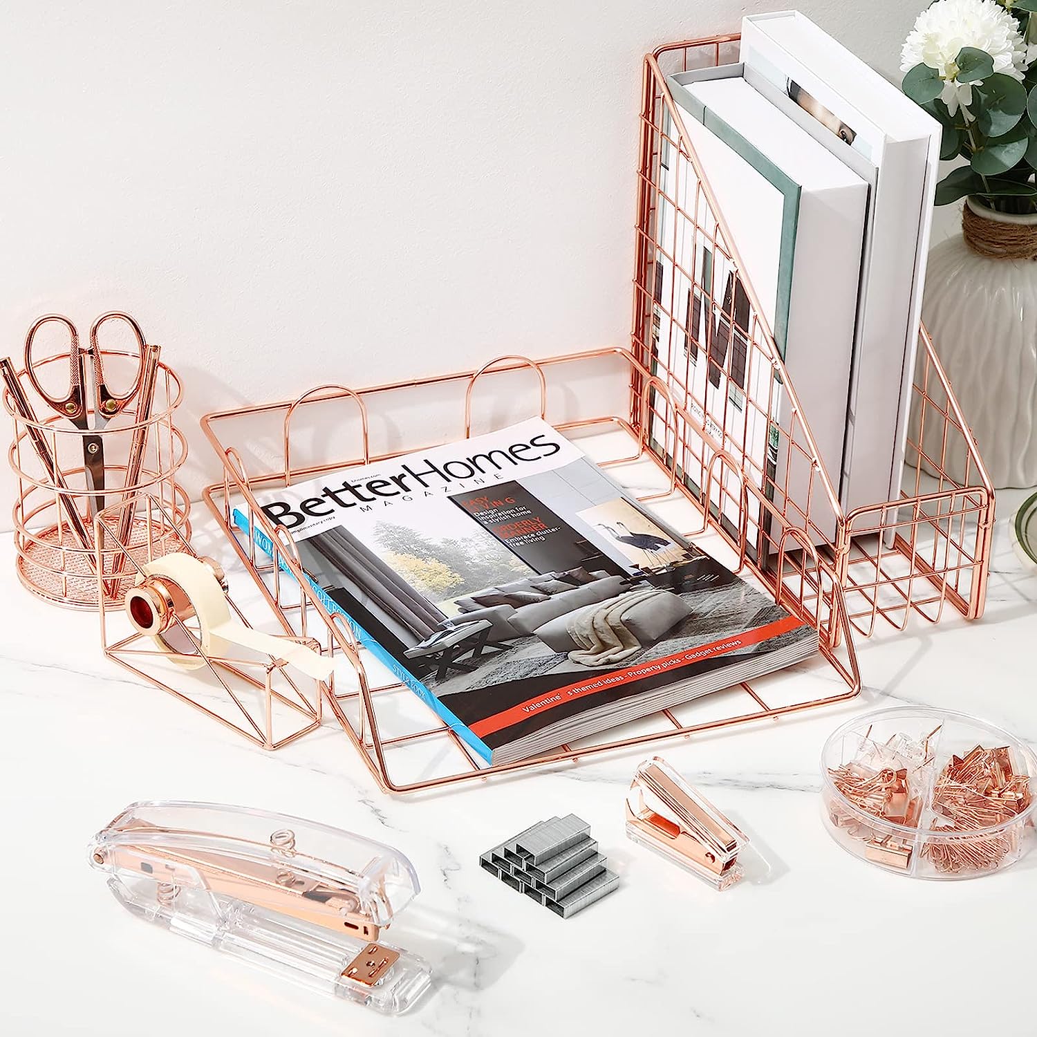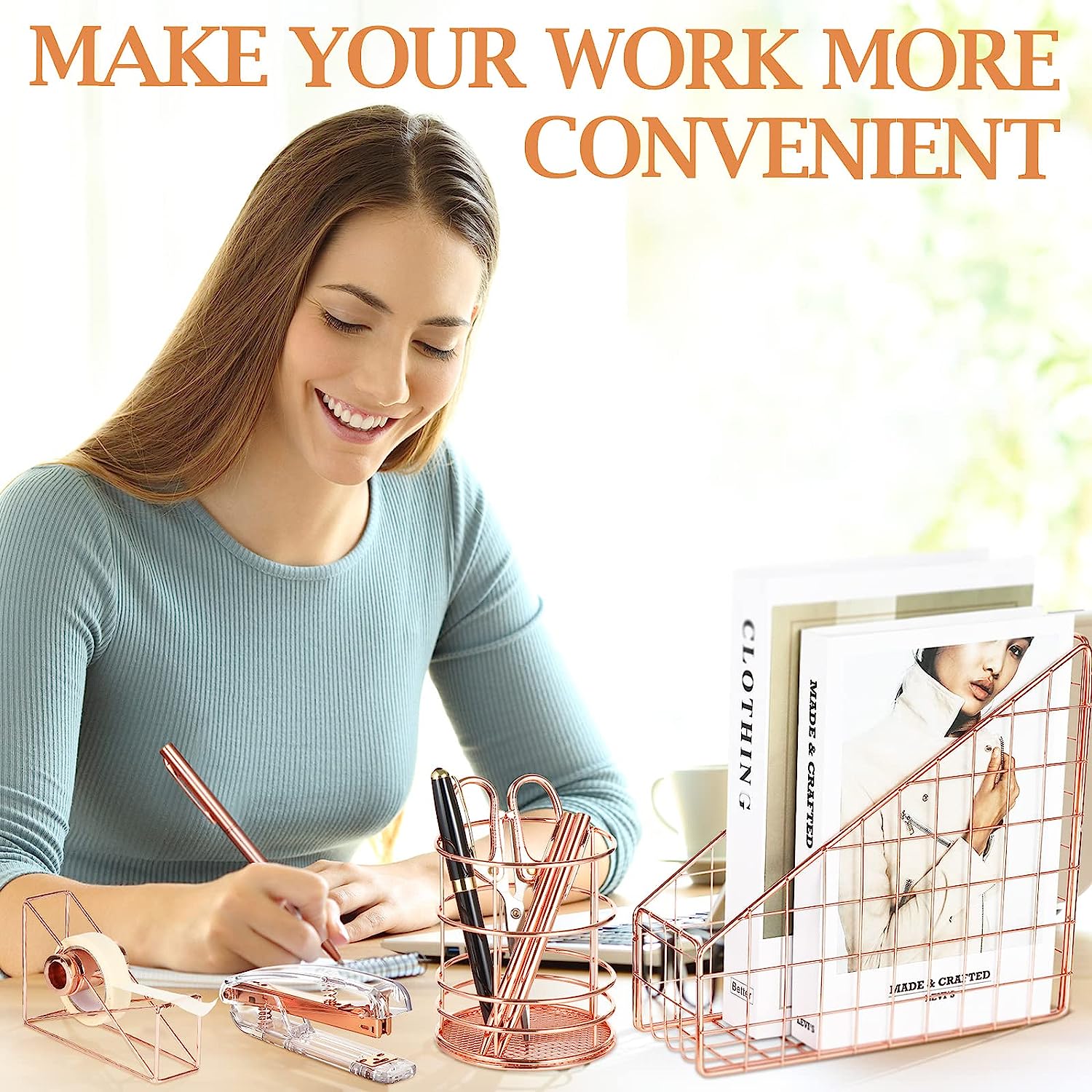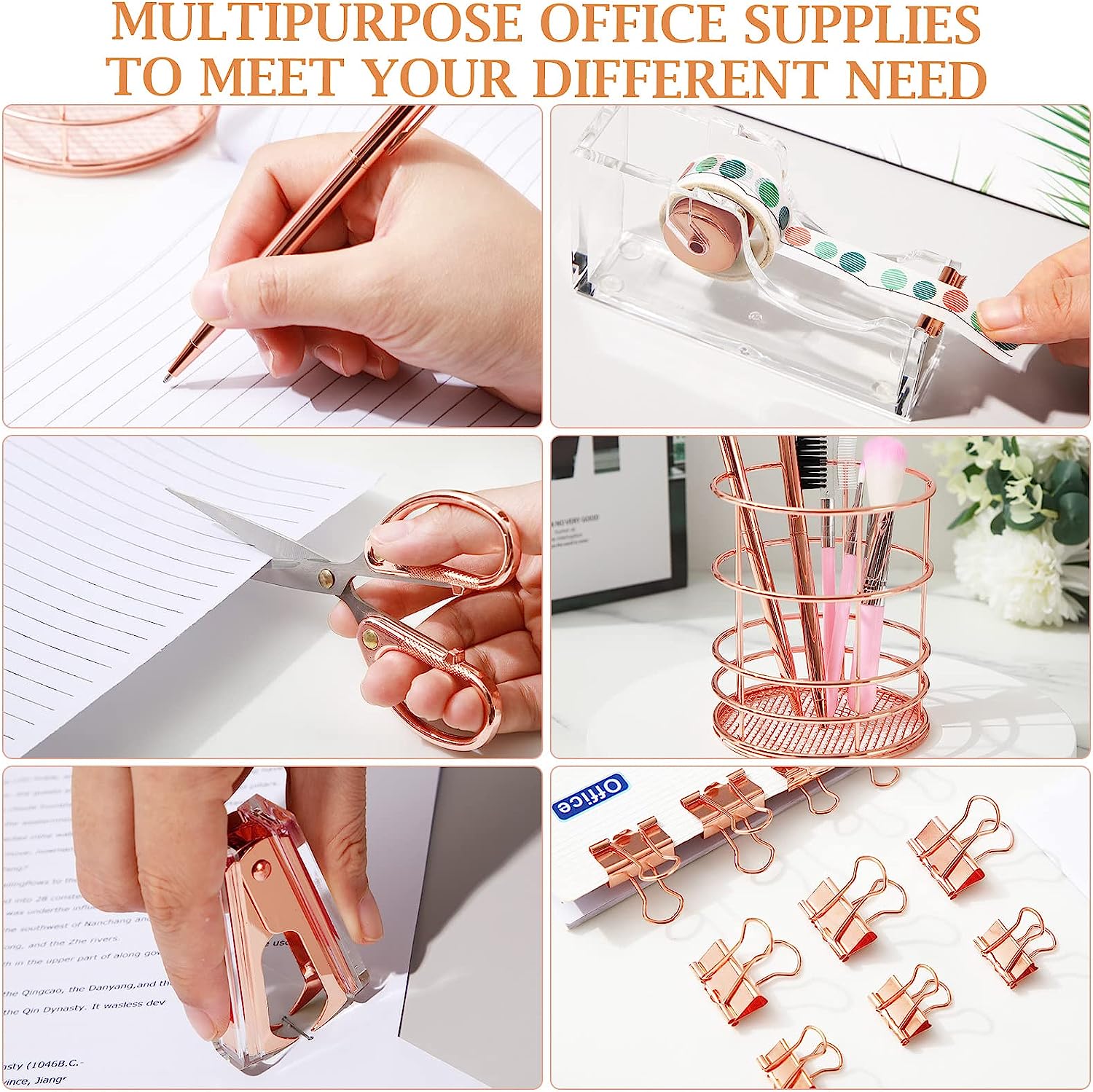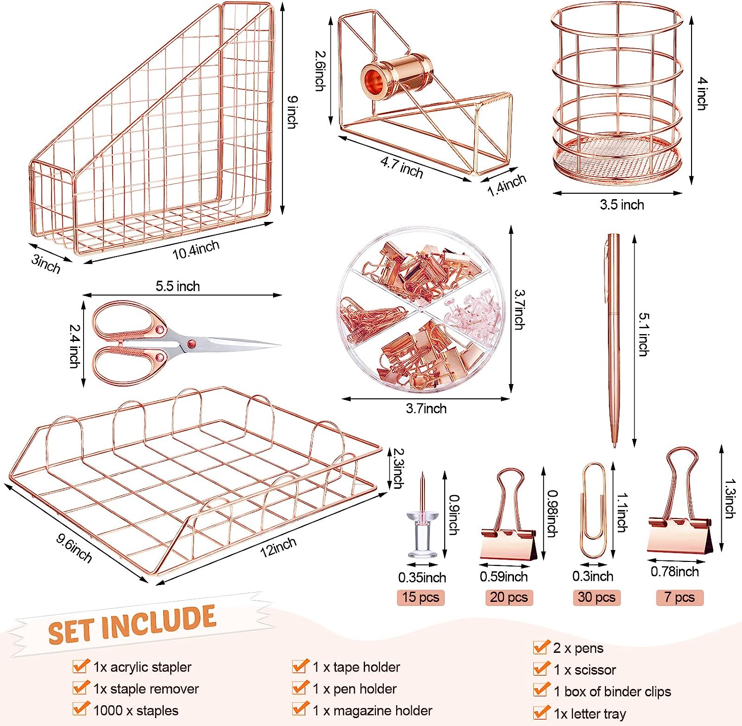 • Nice Combination: you will receive 1 piece of file holder, 1 piece of magazine file organizer, 1 piece of acrylic stapler, 1 piece of staple remover, 1000 pieces of staples, 1 piece of tape dispenser, 1 piece of pen holder, 2 pieces of pens, 1 pair of scissor, and 1 box of binder clips; The rose gold office supplies set can meet your daily and work needs, keeping your desk or desk drawer organized