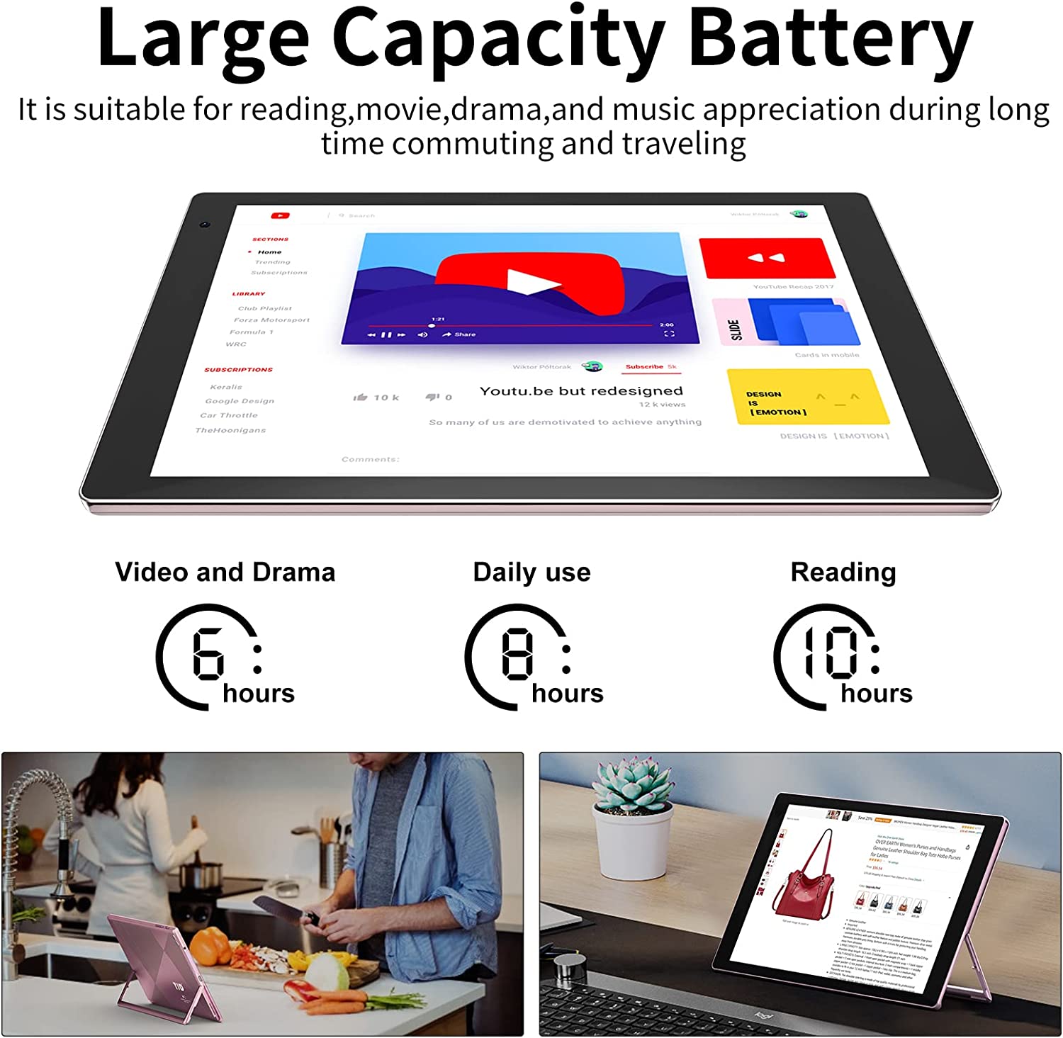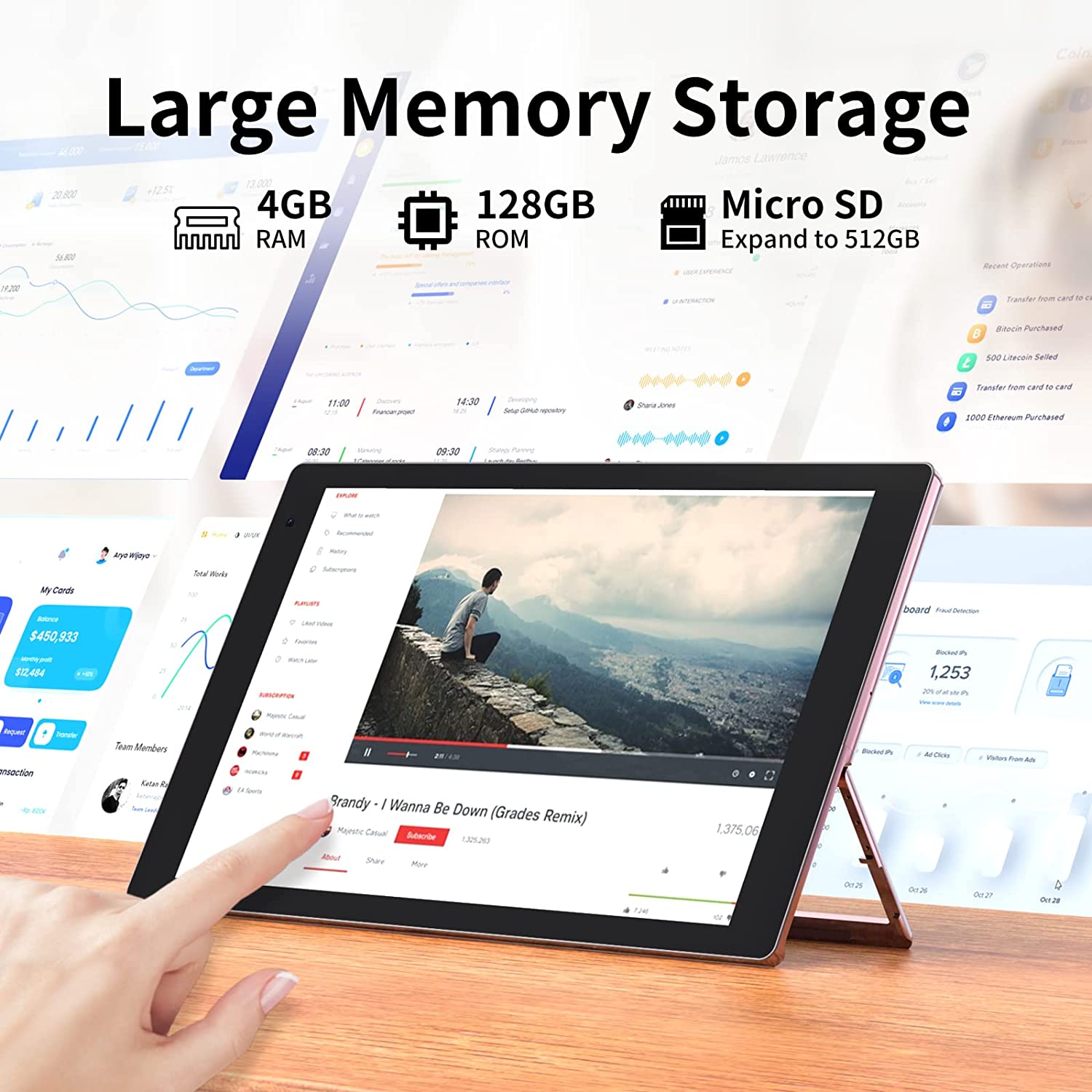 Large Capacity Battery & Great Entertainment - Equipped with a 128GB ROM storage that support most 512GB expand perfect for student, writer, kids. 6000mAh built-in rechargeable battery enables about 8 hours mixed-use of reading e-books, Listening music, watching movies, playing games, or browsing website, This tablet will be a perfect choice.