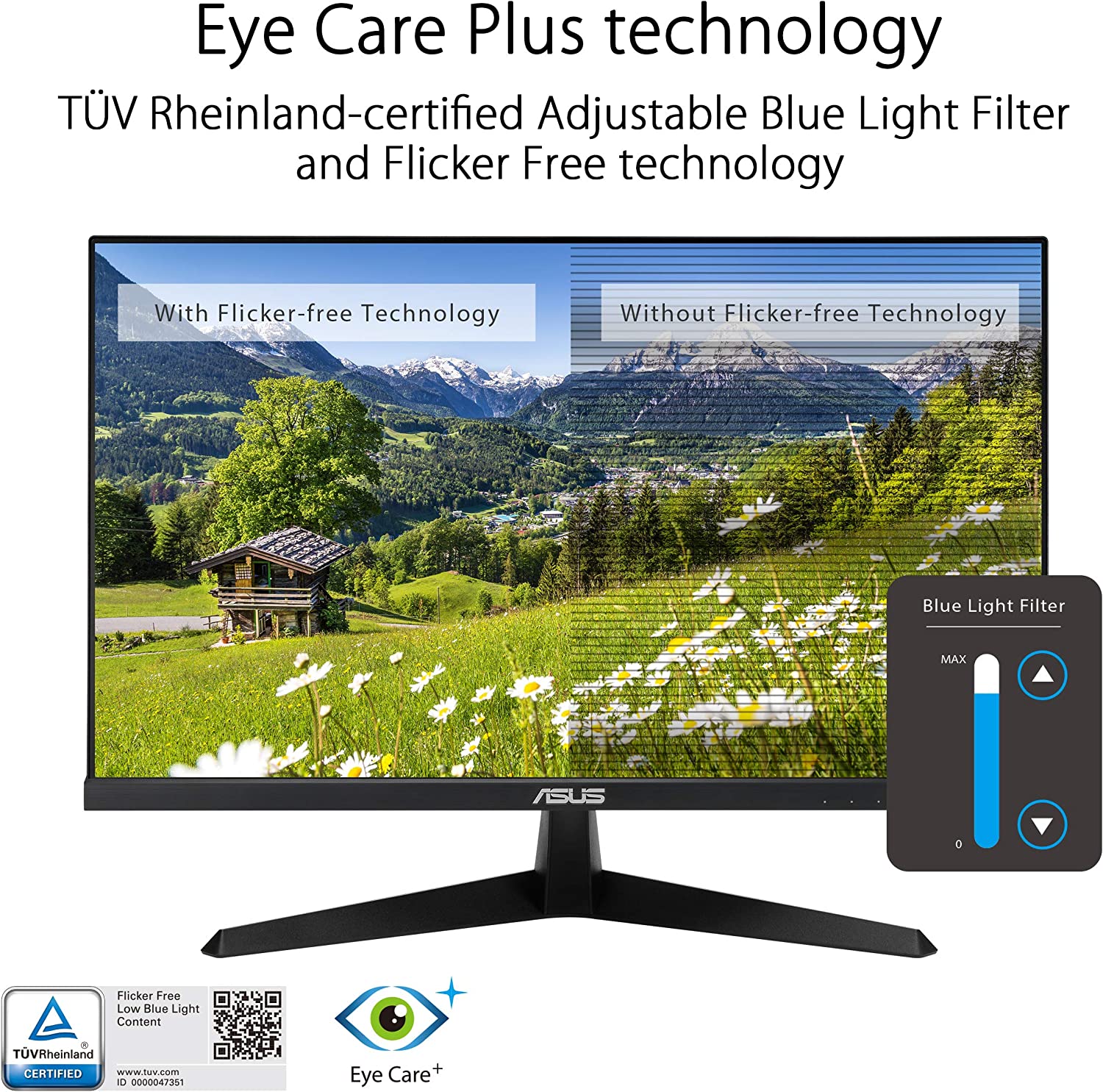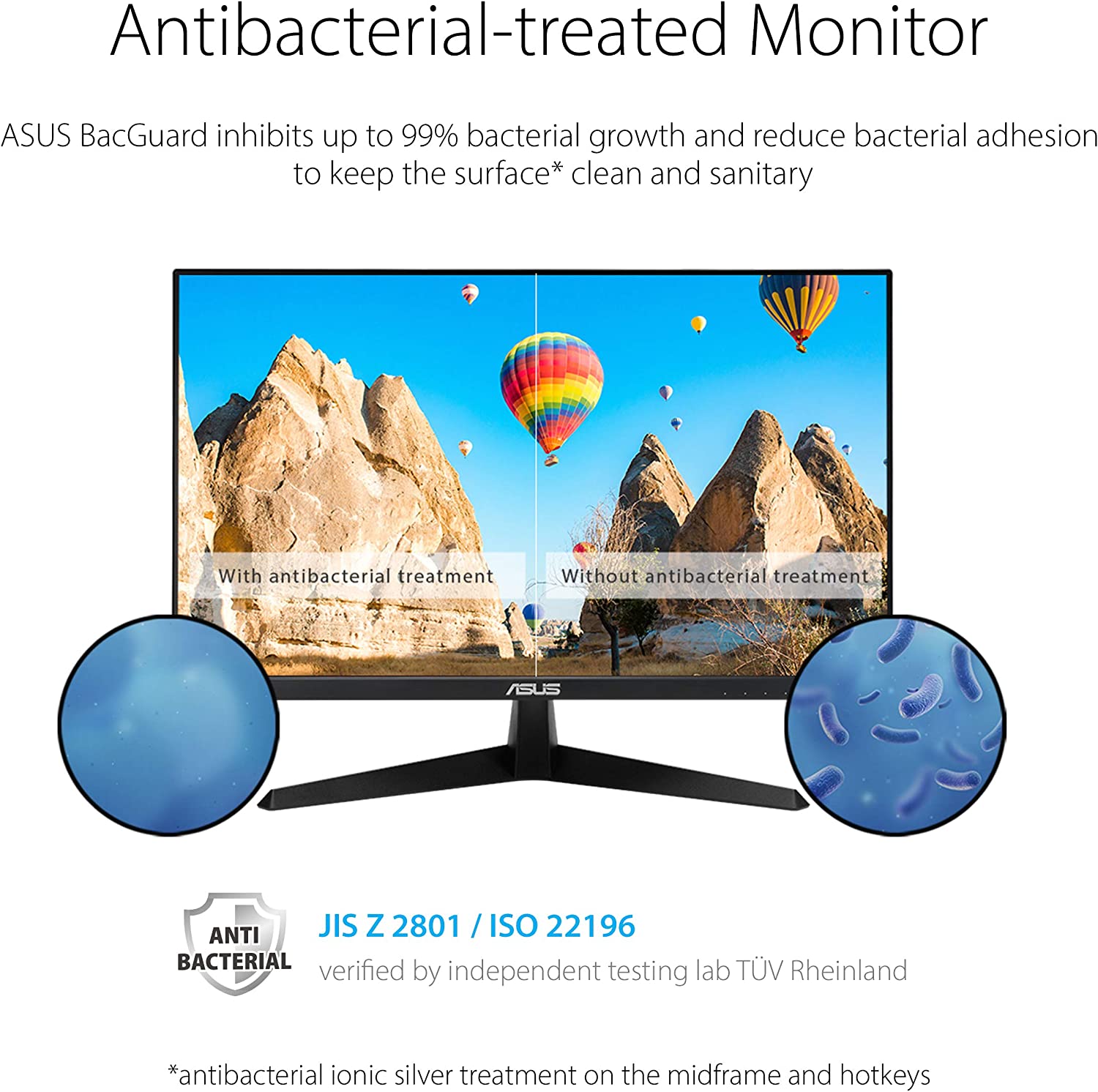 The 23.8” VY249HE monitor is equipped with ASUS BacGuard, a ionic silver treatment applied on the midframe for a more sanitary surface. With Eye Care Plus, the VY249HE features additional color augmentation and rest reminder modes for a more user-friendly experience.