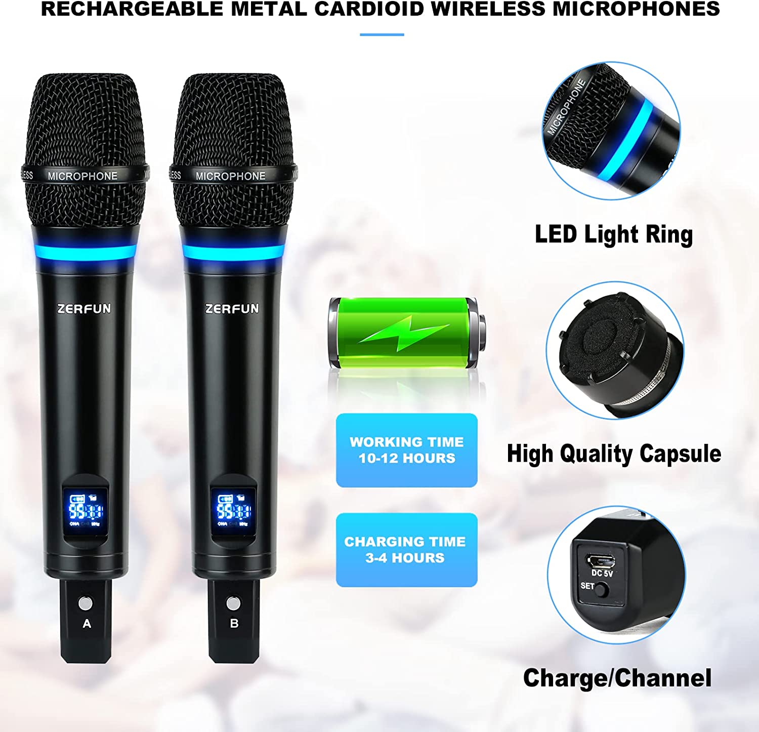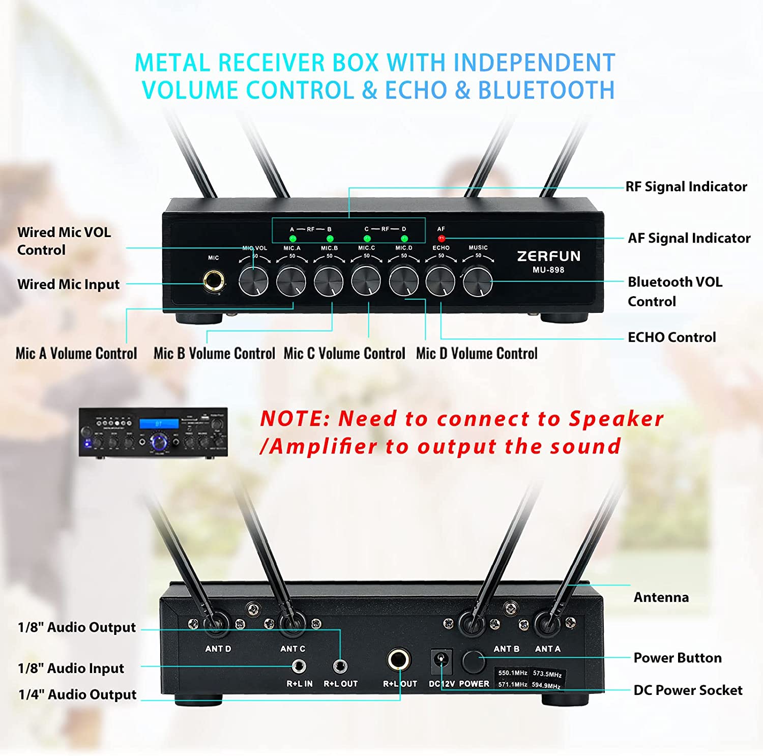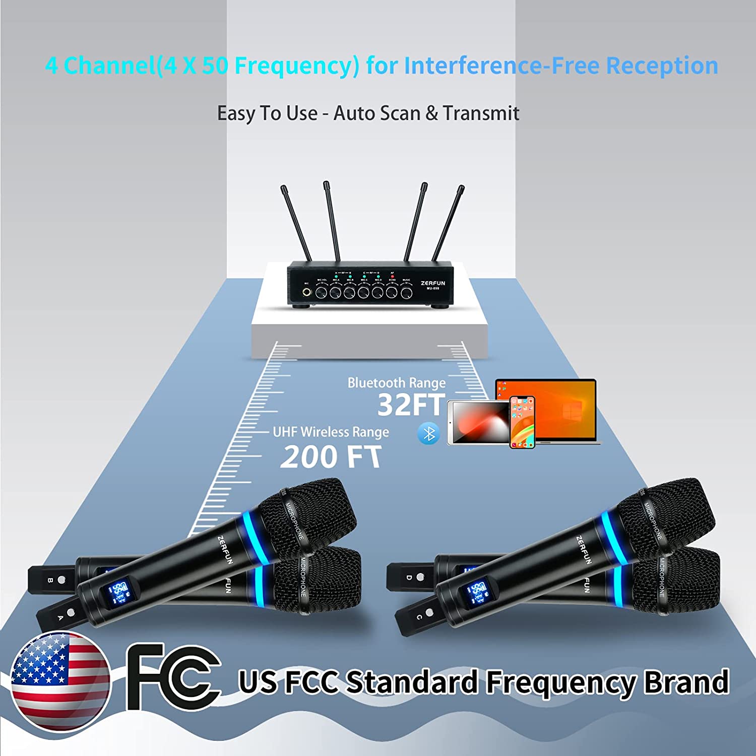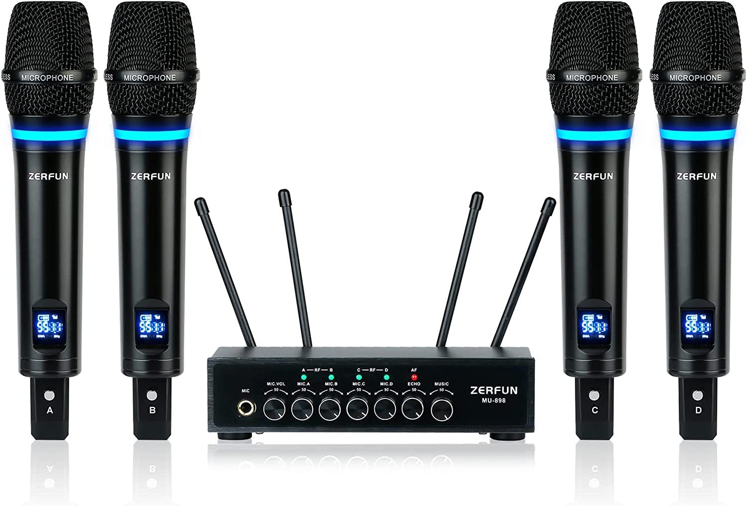 • 4-CHANNEL RECHARGEABLE WIRELESS MICROPHONE SYSTEM: ZERFUN UHF Rechargeable Wireless Microphone System that comes with four rechargeable handheld metal cardioid microphones and metal receiver box with with Independent Volume Control & ECHO & Bluetooth. Perfect for home karaoke, meeting, party, church, DJ, wedding, and much more.