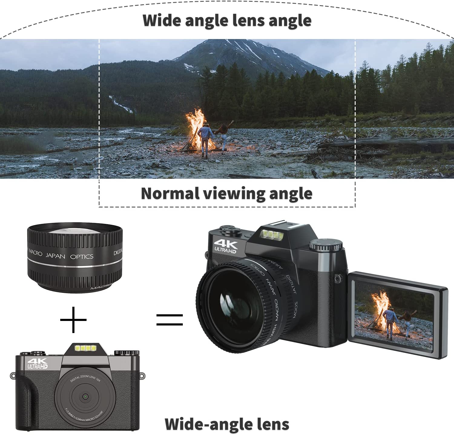 - ?【Digital Camera with Wide Angle Lens & Macro Lens】The 4K camera equipped the camera with a professional detachable 52mm wide angle lens with macro lens, so the camera is great for capturing wide horizons easily, and macro lenses capture the diversity of the tiny world. Sharp 4K photos can be ruled out with manual focus. With a knob on the top of the camera, you can switch between photos, video, time-lapse photography and other features.