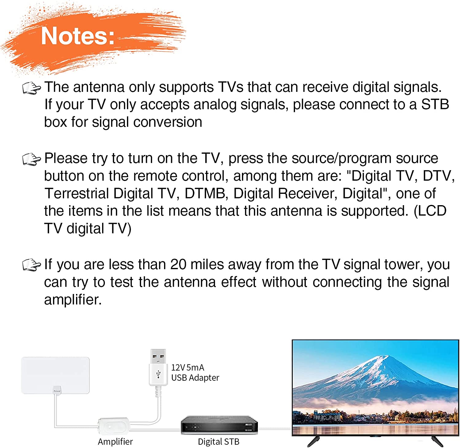 - If the signal is not satisfying or only a few channels are available, try connecting or removing the amplifier. (You can Remove the Detachable signal amplifier if your house is within 20 miles range from the tower. We do NOT Recommend to use the signal amplifier if your house is very close to the broadcast tower and the signal is already very strong.)