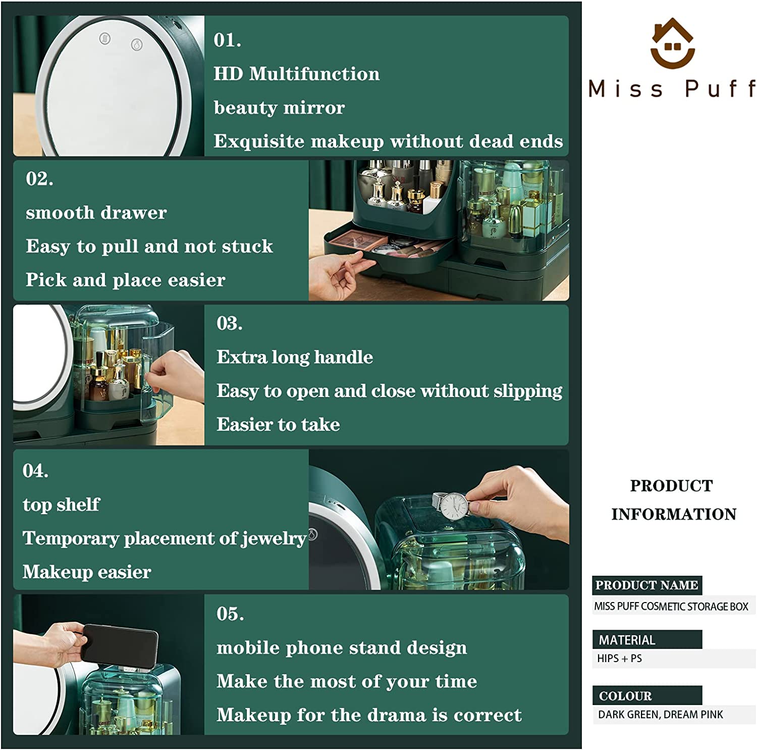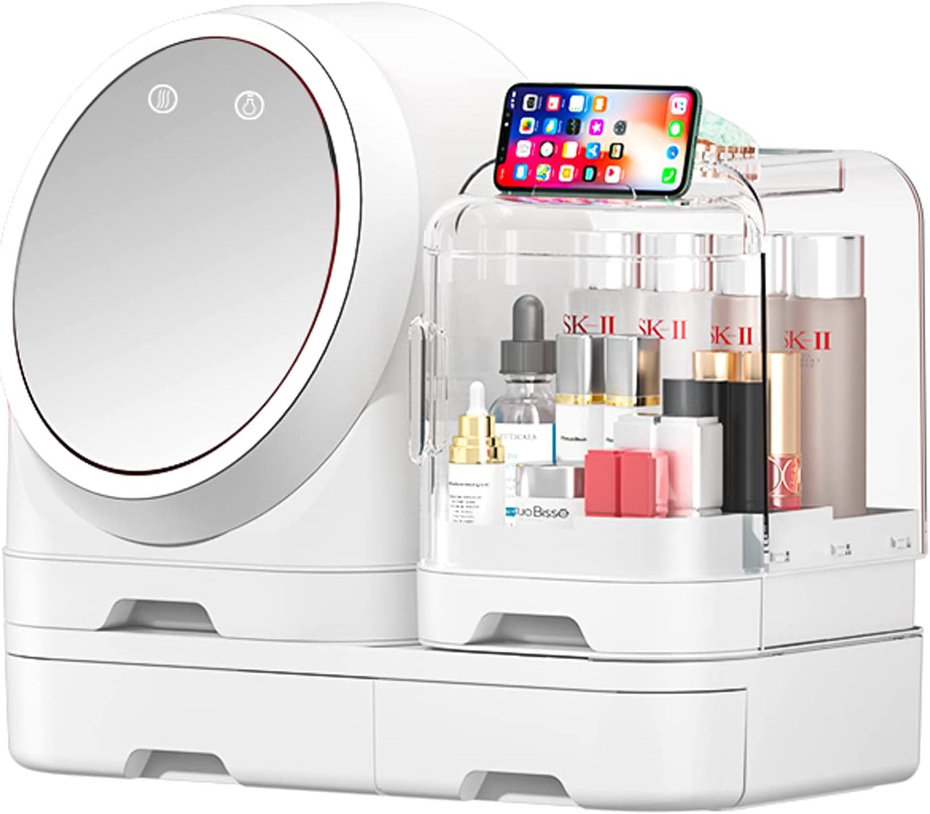 • Large-capacity storage space: The divided spaces and drawers are suitable for most cosmetics, including lipstick, foundation, blush, eye shadow, eyebrow pencil, mask, perfume, jewelry, and other items.