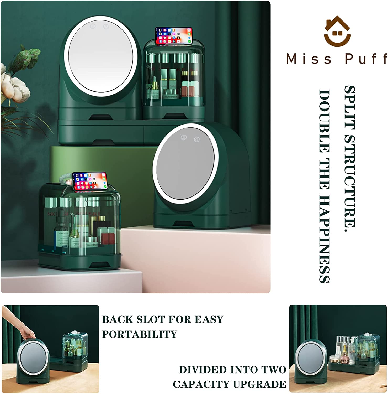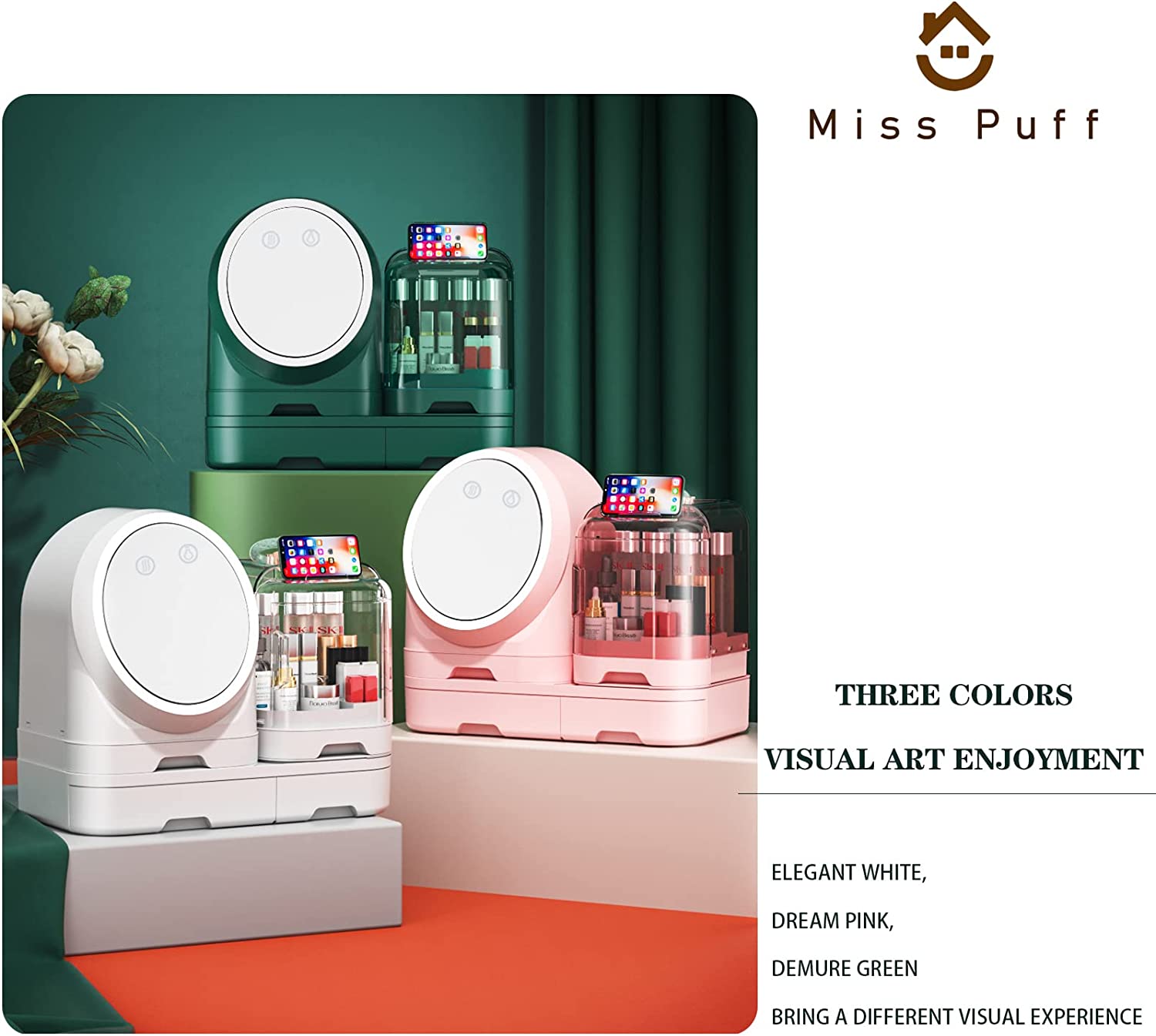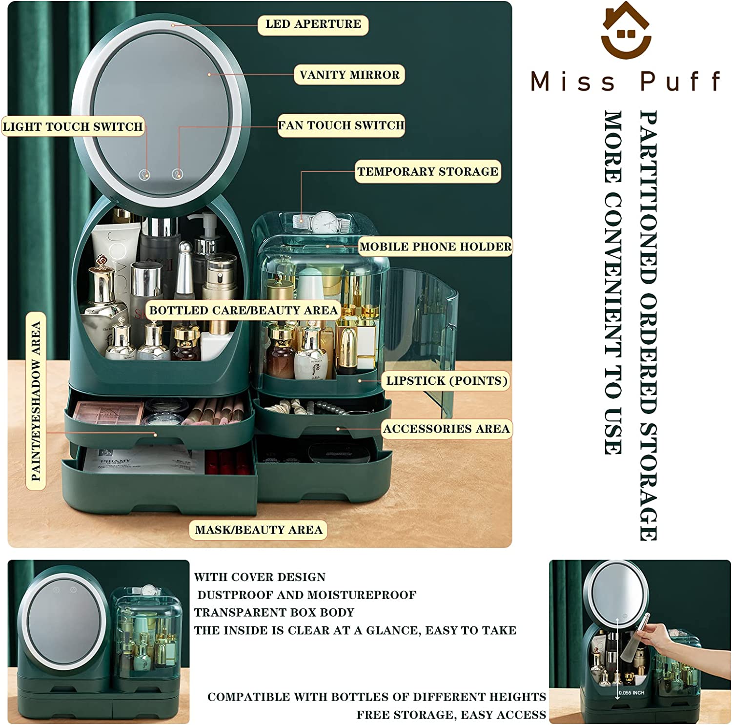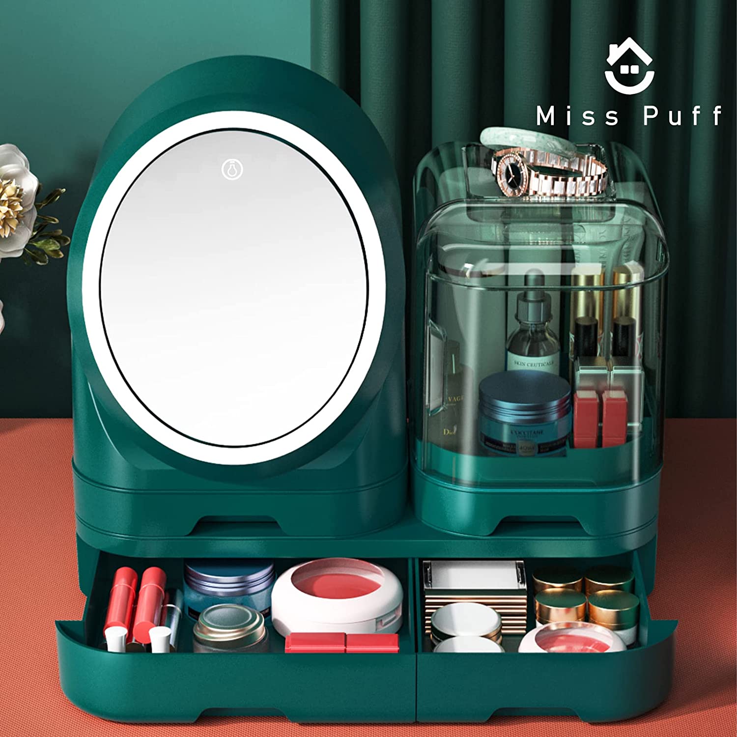 Miss Puff Makeup Organizer with LED Mirror and Fan, Large Capacity Cosmetic Storage Display Case, Waterproof and Dustproof Skincare Organizer for Bathroom and Vanity Dresser