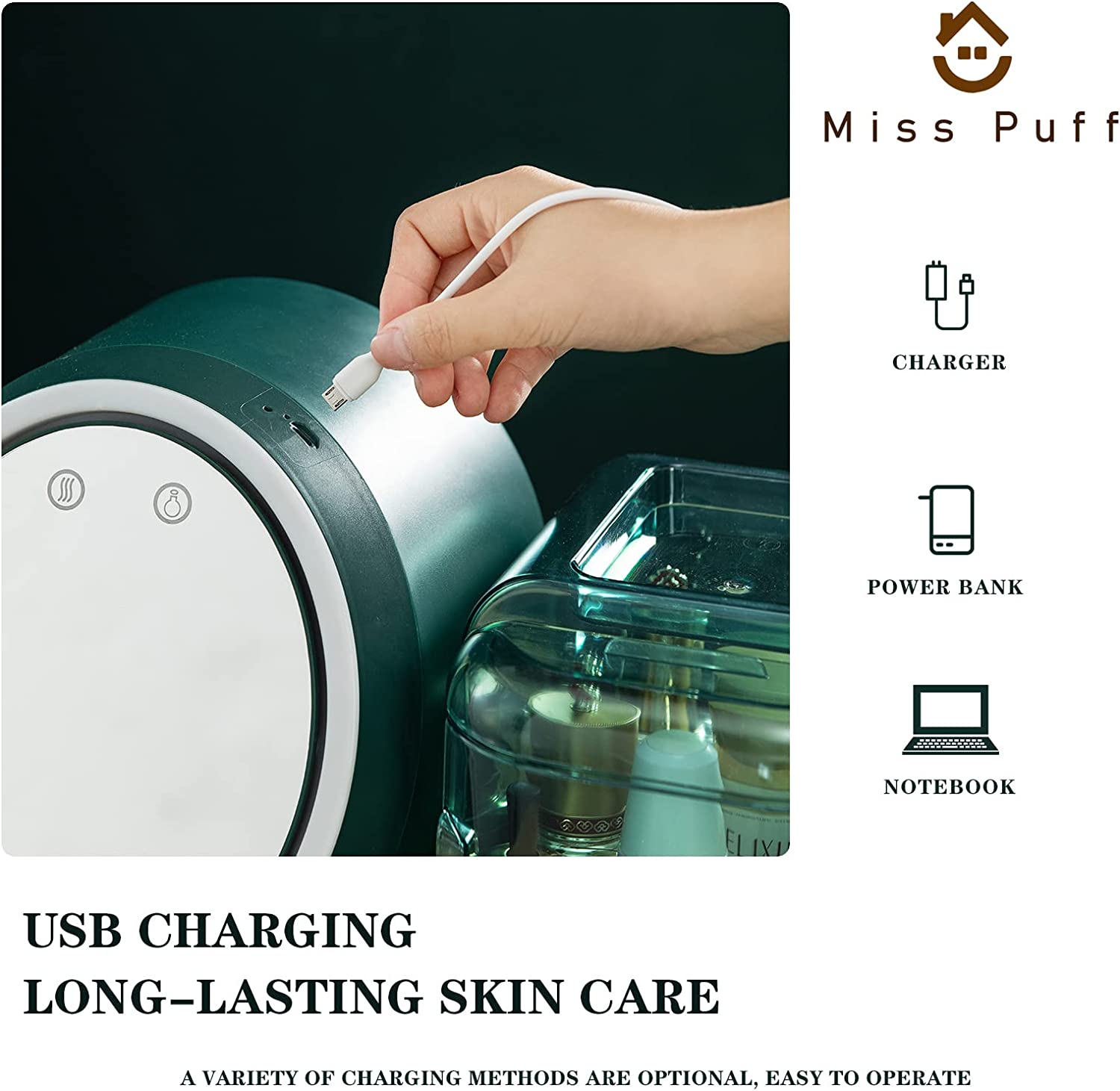 • LED mirror and fan: This makeup storage box comes equipped with a 360-degree rotating LED mirror that can be adjusted for either standing or sitting use, and a fan unit that boosts lotion absorption and saves time. It can be charged via USB for easy use.