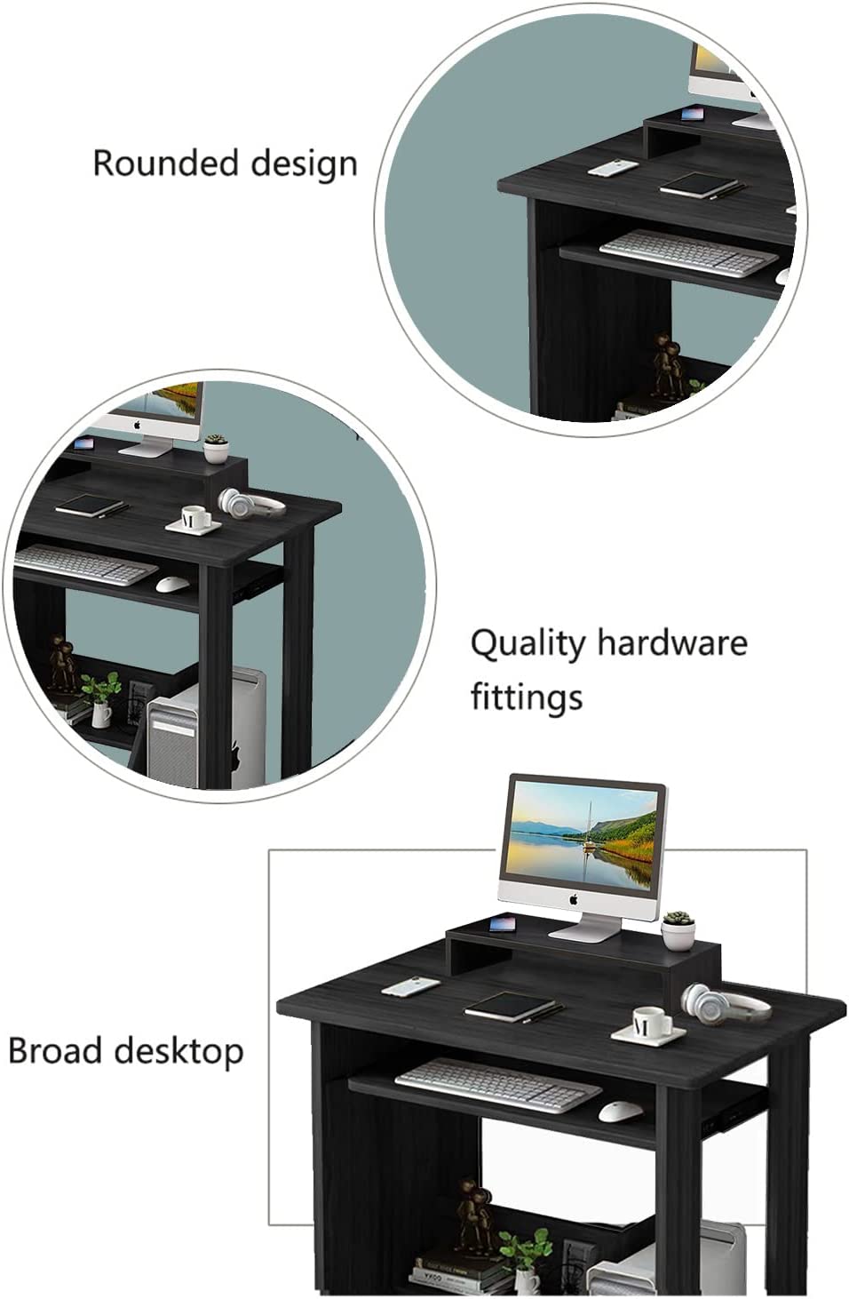 • 【Spacious Space】:29.5×17.7×30in,Computer Desk with Monitor Stand and wide desktop provides plenty of surface space for writing and home-office activities, which lets you work with ease. The bottom storage shelves can easily accommodate your books, documents, and other office items. your books, documents, and other office items.