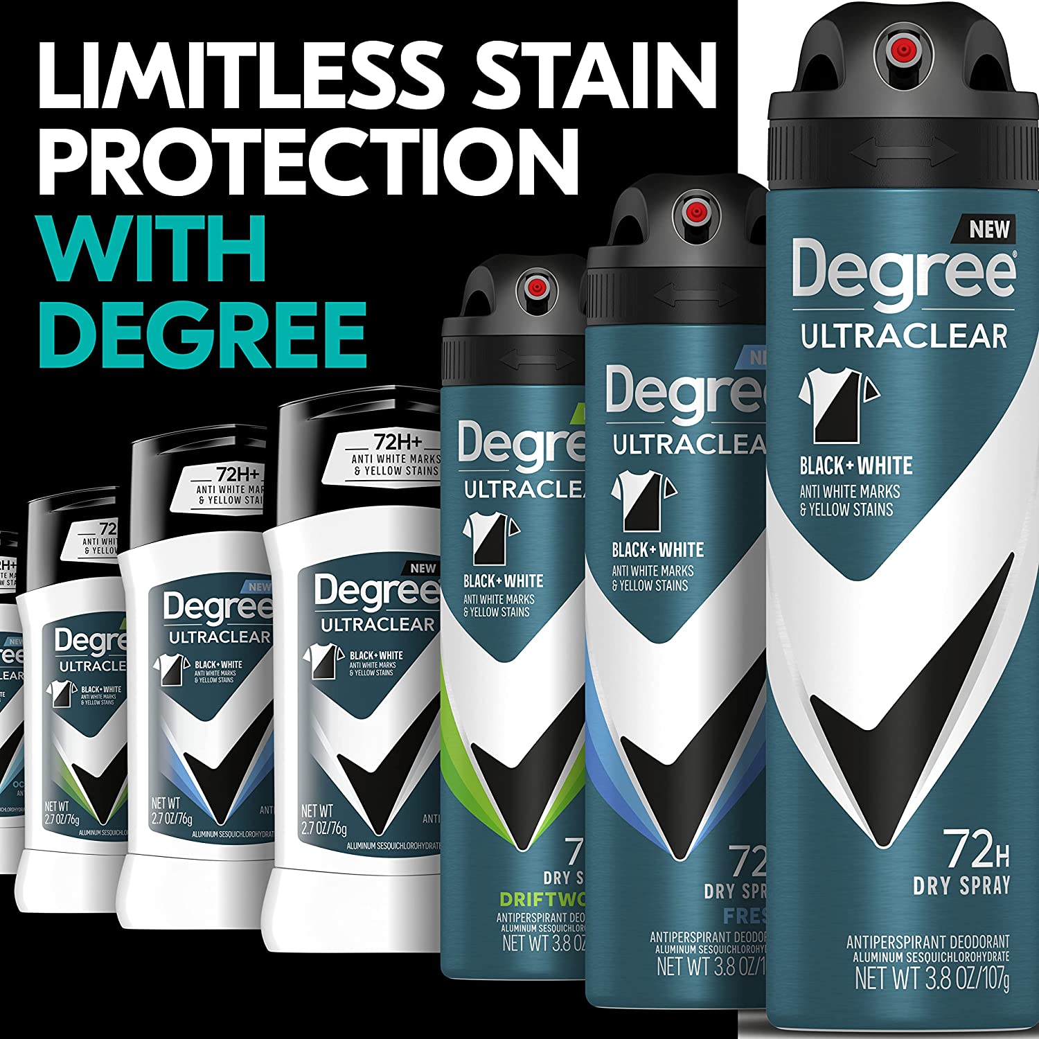 • WHITE SHIRT, BLACK SHIRT, NO PROBLEM: Degree UltraClear Black+White Antiperspirant Deodorant delivers 72-hour sweat and odor protection with anti-white marks and anti-yellow stains technology