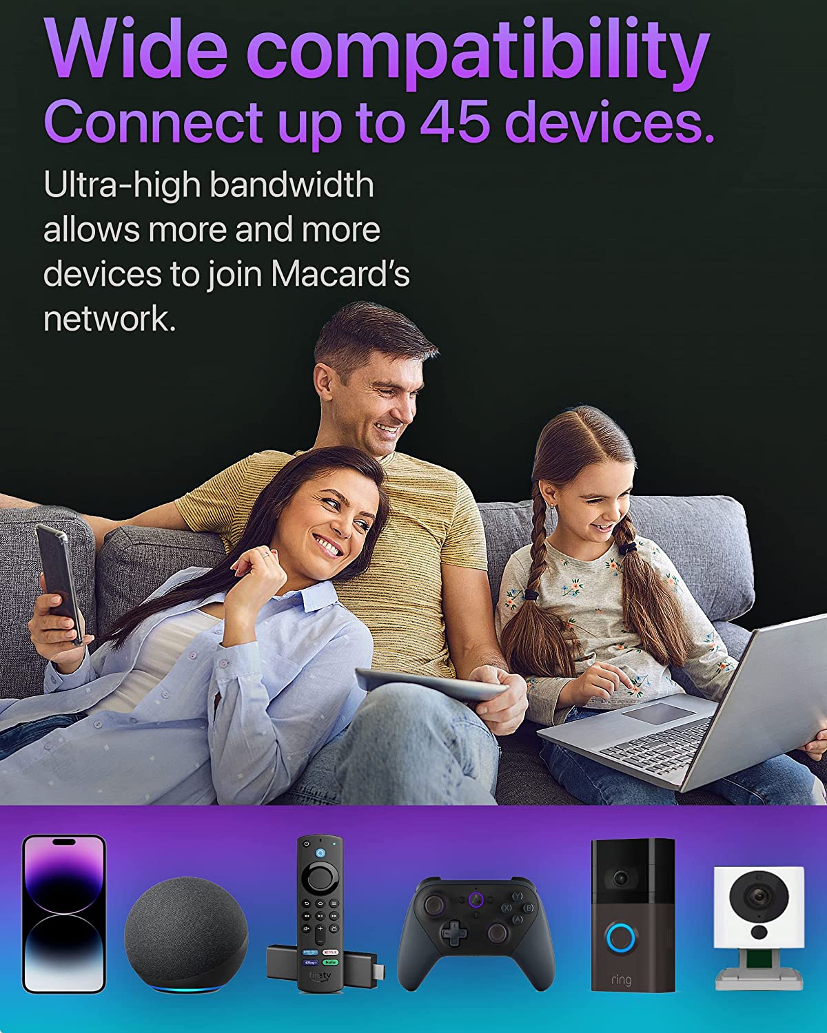 - 45 Devices, Zero Bog - House full of data hogs? Macard’s internet range booster with ethernet port eliminates the problems fast, pumping out interference-free, lightning fast data capabilities to all the tablets, smart speakers, Alexa devices for home, IP cameras and whatever the innerwebs invents next. Without bogging your own stream down.