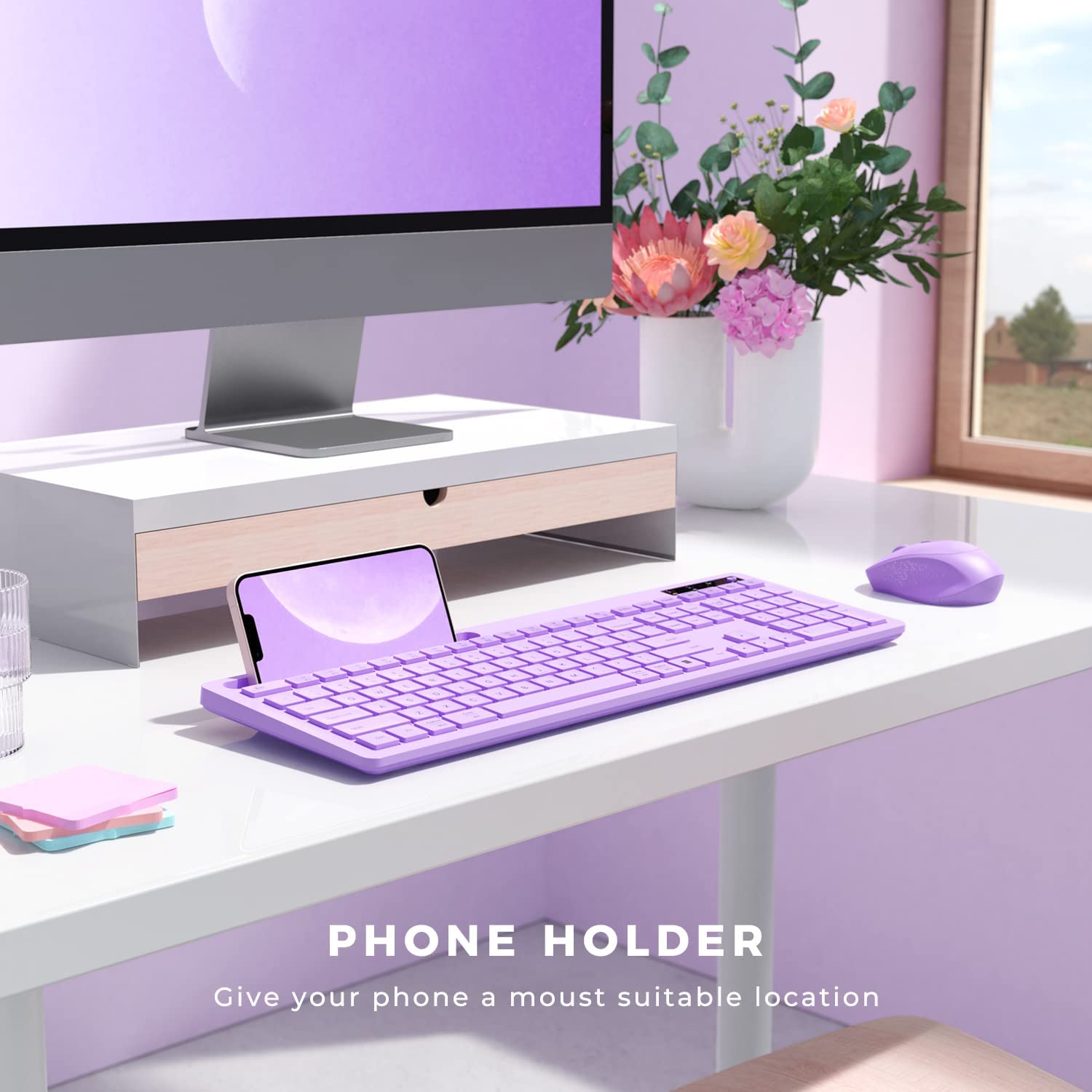 - Full Size Keyboard with Holder -- Even when working with office computer, you’ll never miss any messages from your phone with this purple keyboard, since the built-in cradle can prop up your smartphone horizontally or vertically at a perfect angle to read or watch videos
