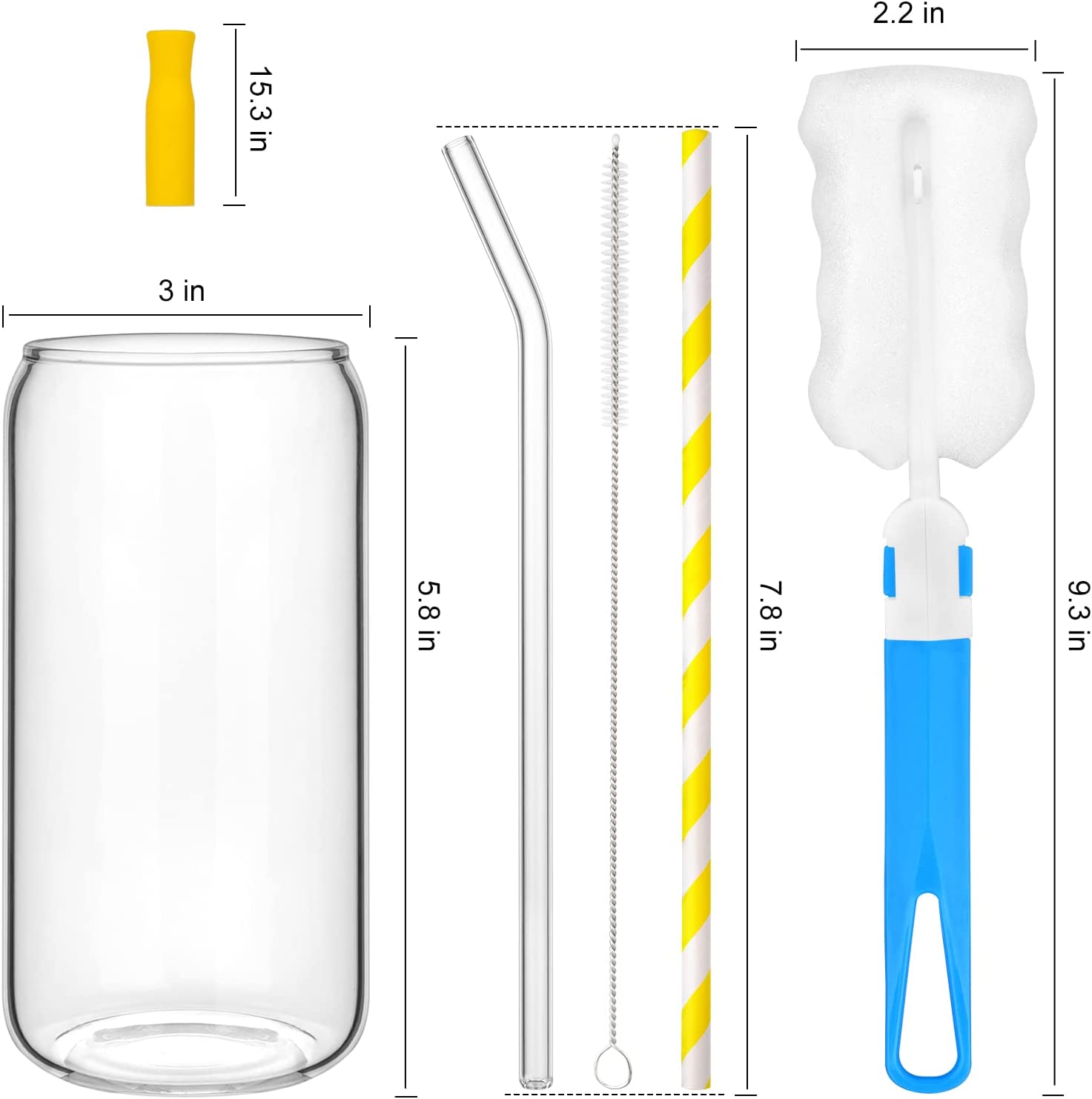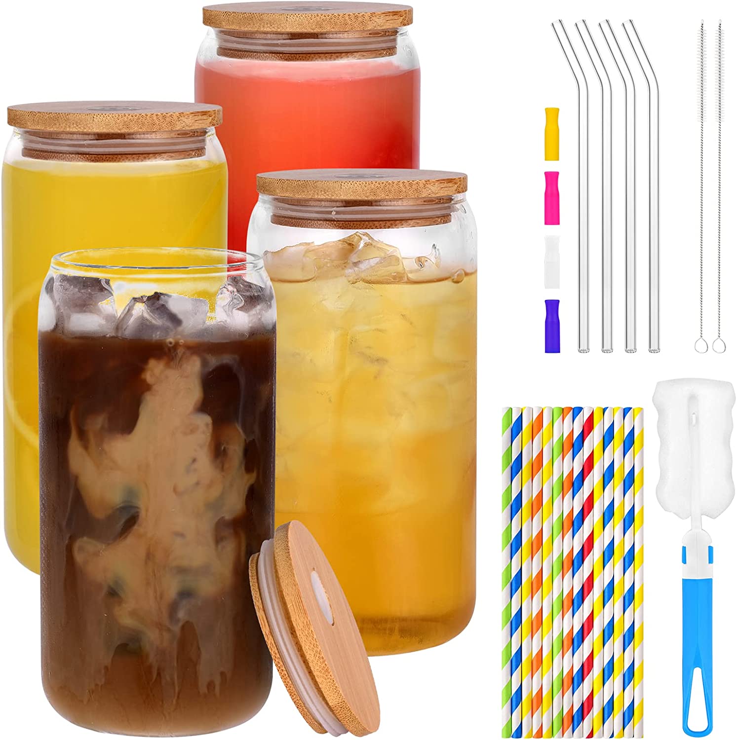 [CLASSIC ICED COFFEE CUPS SET] The luxury drinking glass set includes 4 pcs 16oz beer shaped glass, 4 bamboo lids, 4 reusable glass straws, 2 straws brush and 1 cup cleaning brush. Perfect size: Diameter - 3", Height - 5.8". Classic style glass cups, simple and refined, ideal for a variety of beverages.