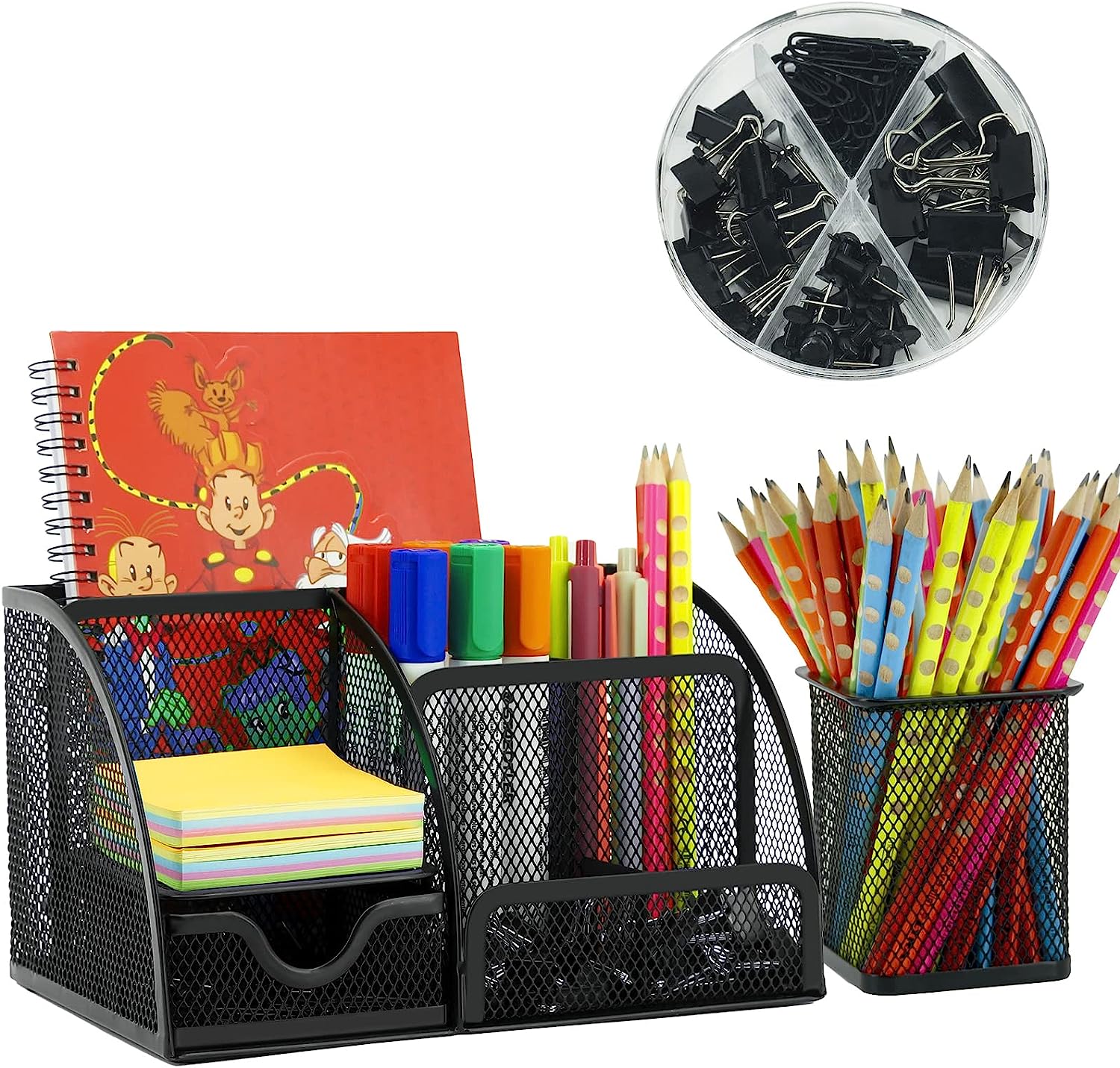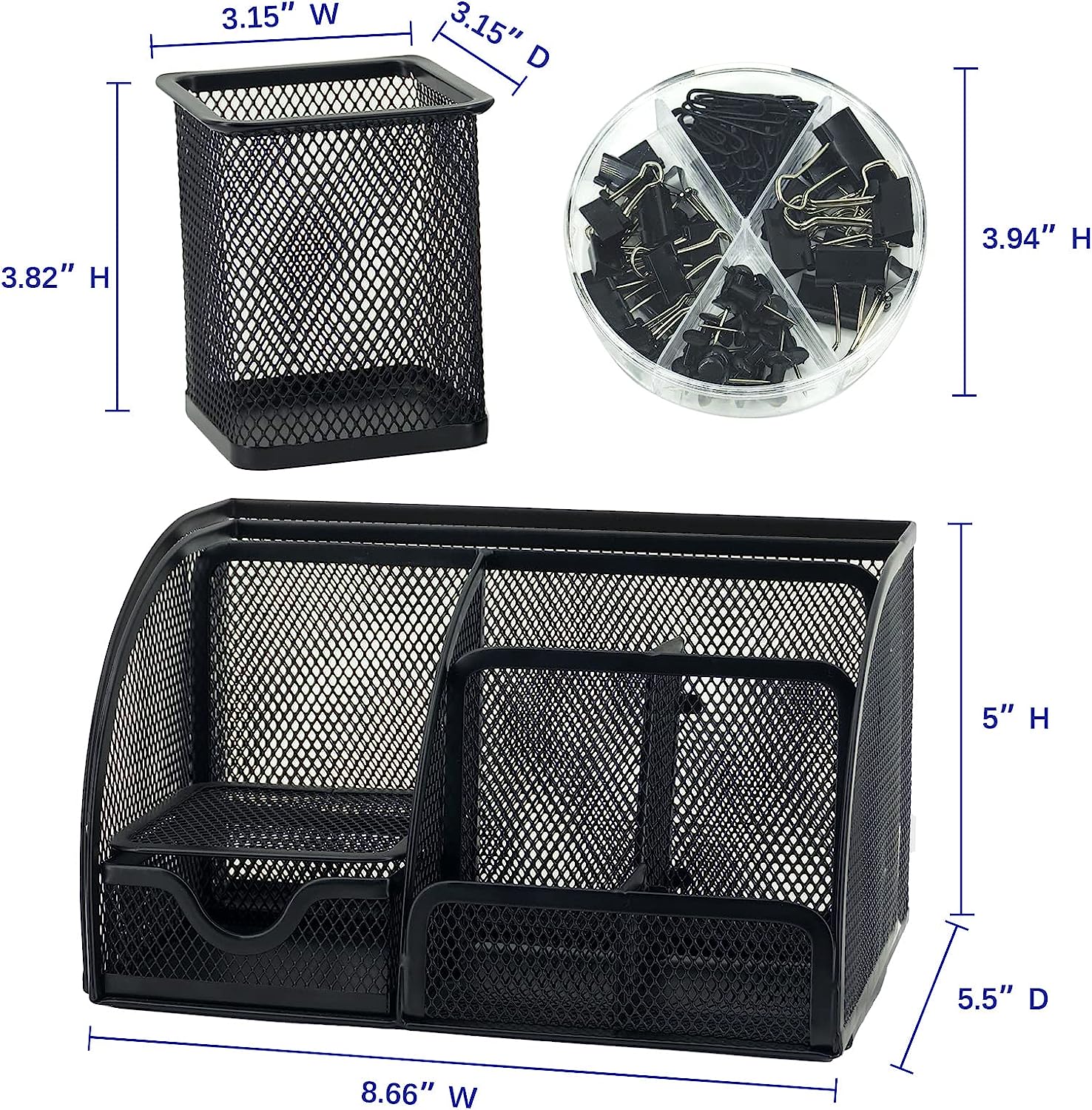 Our Mesh Desk Organizer Caddy with Drawer features six compartments, a pen holder, and a drawer to keep all of your office supplies in one convenient location. Plus, our set includes 72 Paper Clips and Binder Clips in a sleek black finish to help keep your documents organized.