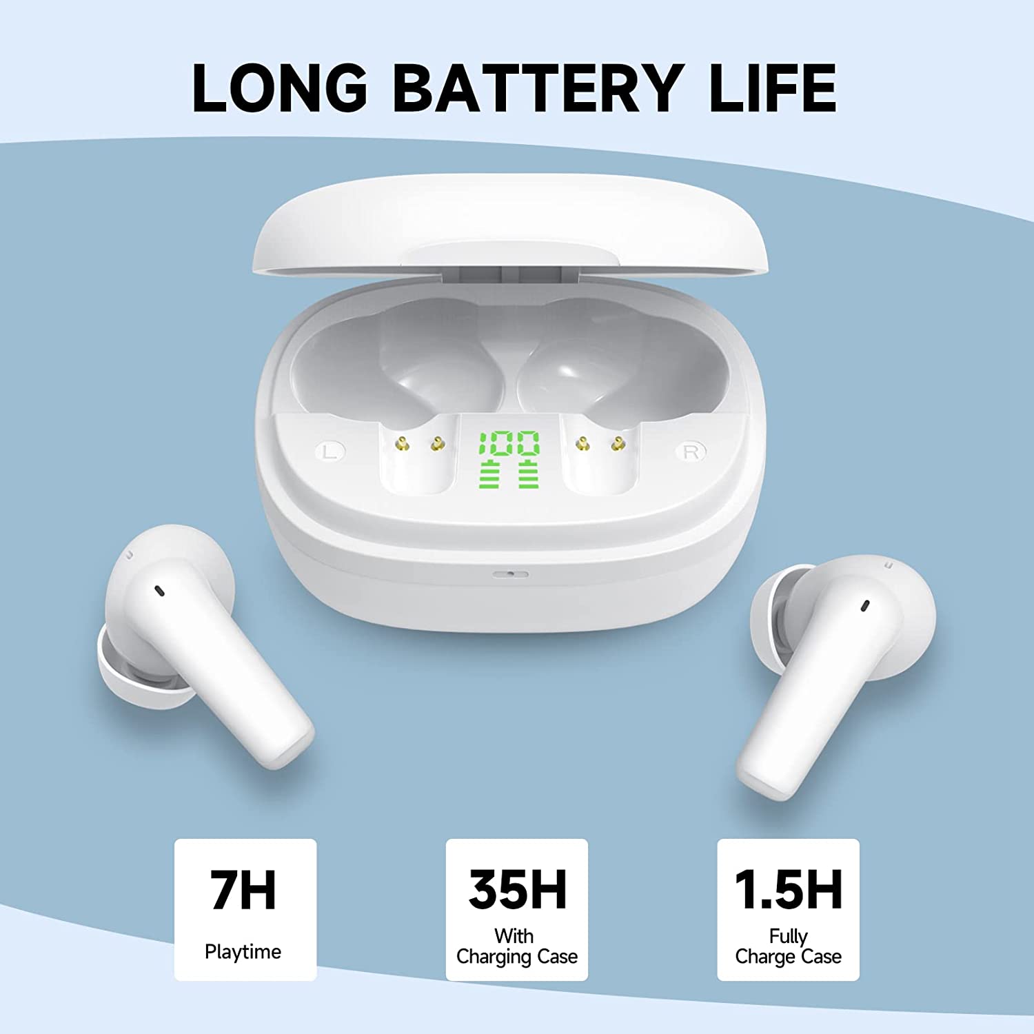 • 35 Hours Battery Life:Aowoka wireless bluetooth headphones have Type-C fast charging, which takes only 1.5 hours to fully charge. Each earbud lasts for 6 hours on a single charge, and the charging case provides an additional 35 hours of playtime.