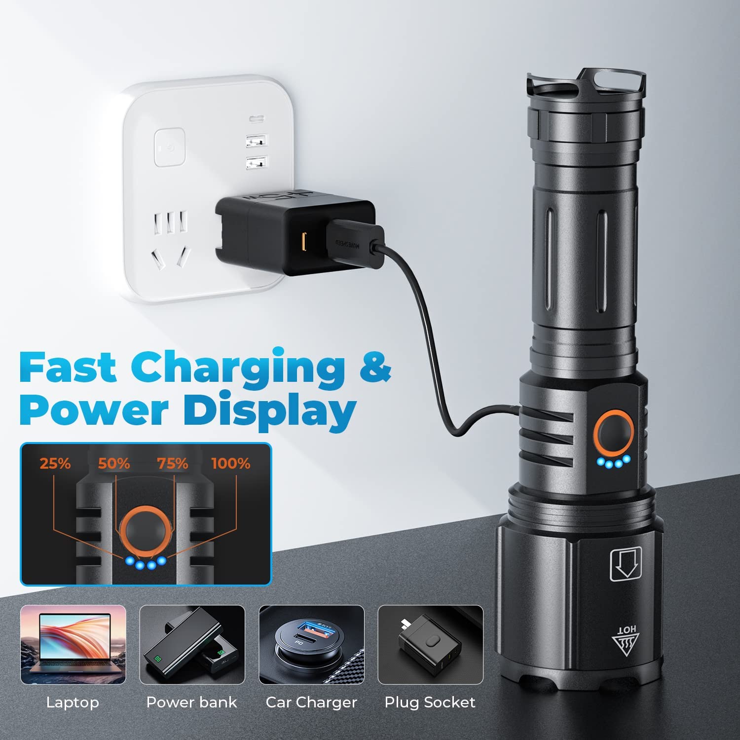 【USB Rechargeable & Power Display】2 Pack Rechargeable Flashlights built in fast charging,and comes with 5000 mAh large-capacity power supply,You can experience up to 12 hours of brightness with a full charge.You can see the remaining power of the flashlight and charge it in time.