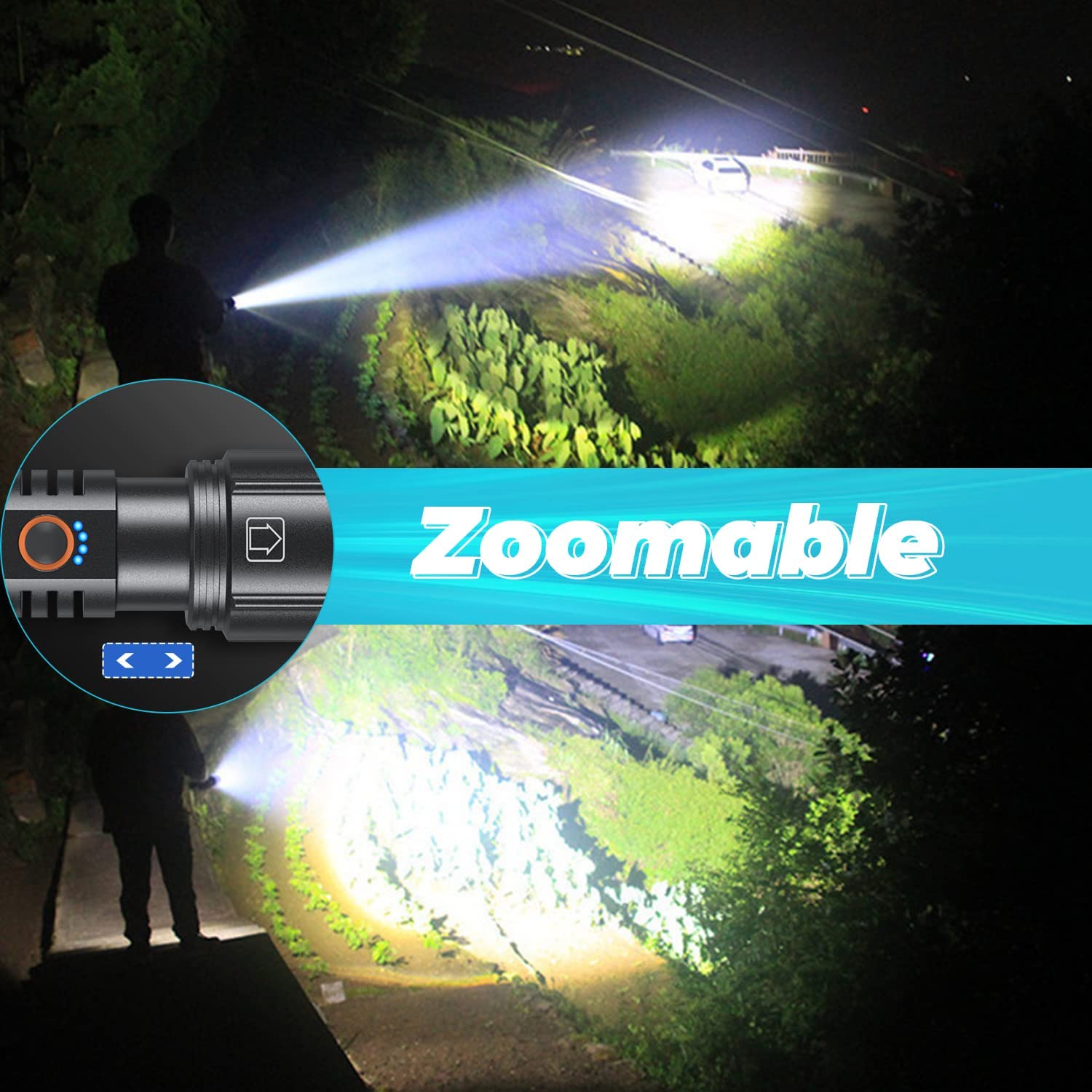 【250,000 Lumens Flashlight】The Brightest Flashlight is equipped with an upgraded P70 chip, the maximum output is 250,000 lumens, and the irradiation range can reach 1000 meters. This LED flashlight can not only meet your daily lighting needs,but also suitable for outdoor lighting such as emergency and camping.