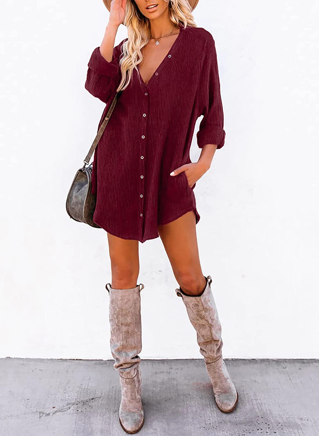 • Fashion Design: Long Sleeve, Button, V Neck, Solid Color, Oversized Corduroy Shirt Dress.