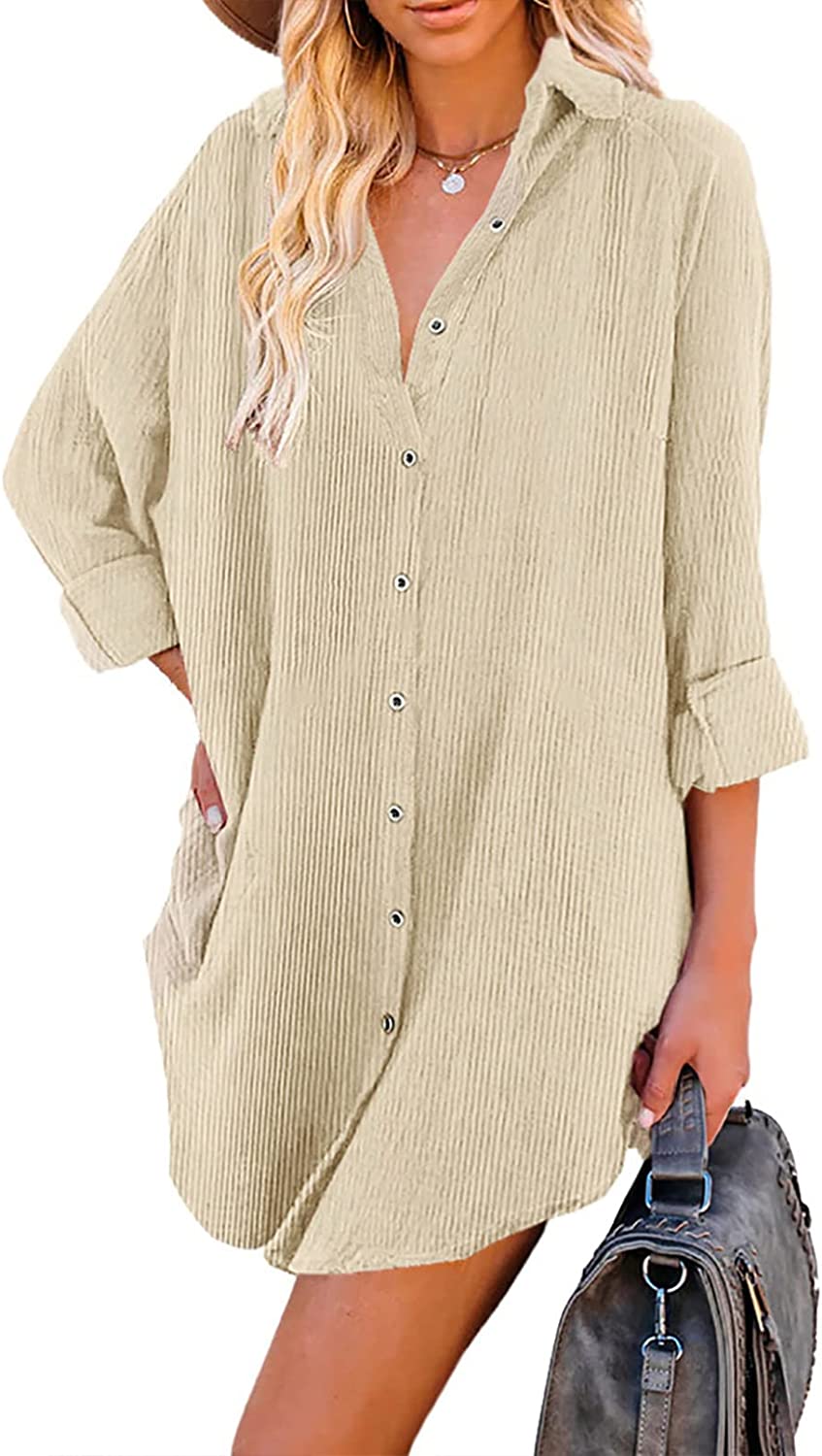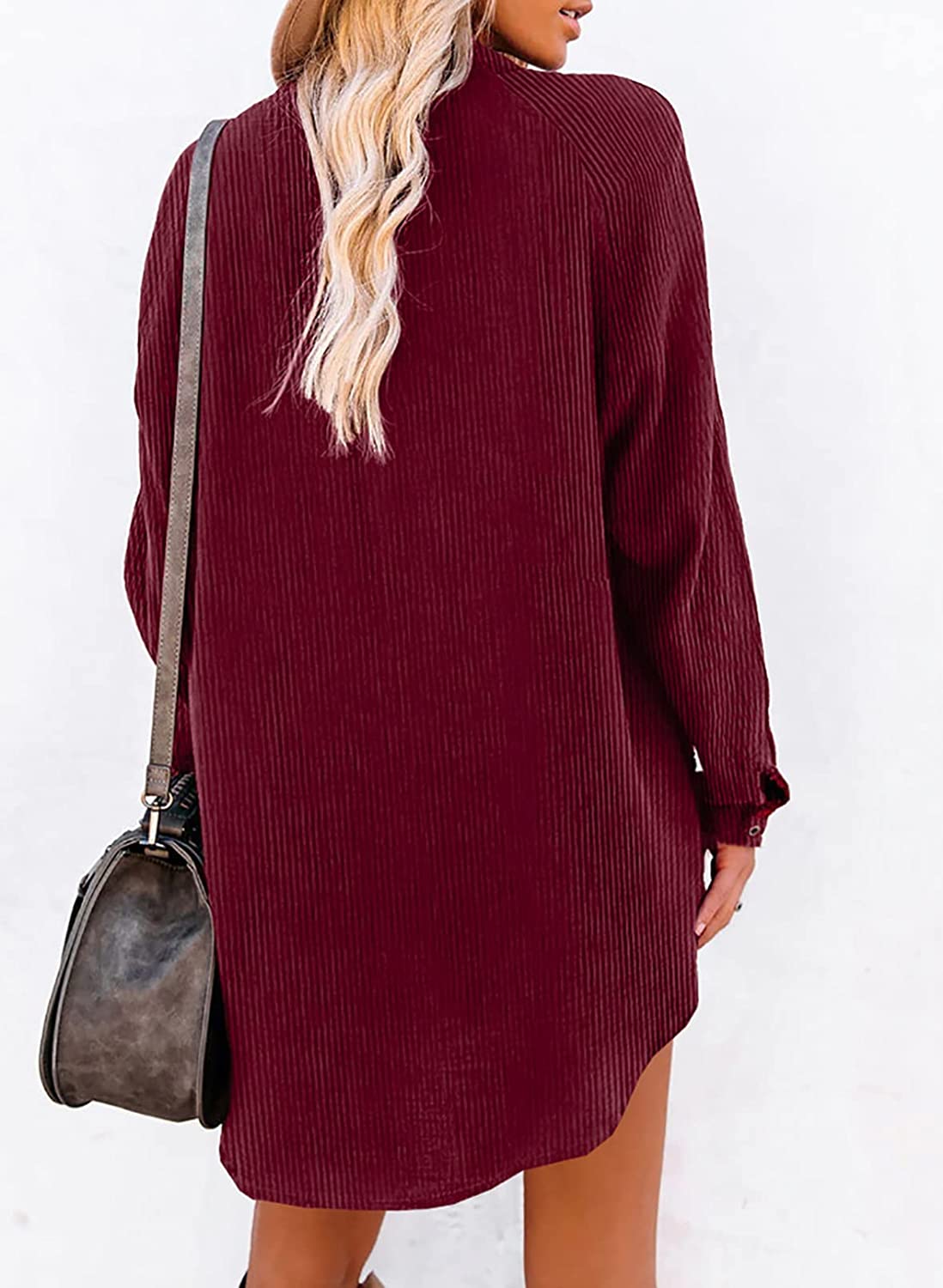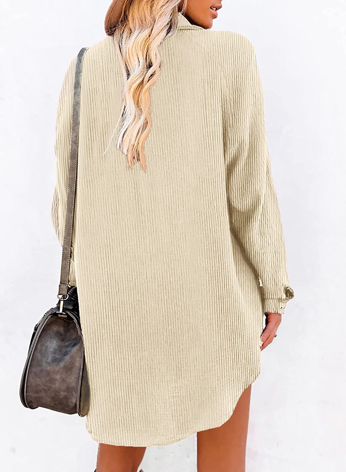 Astylish Women Casual Long Sleeve Button Down Oversized Corduroy Shirt Dress with Pocket