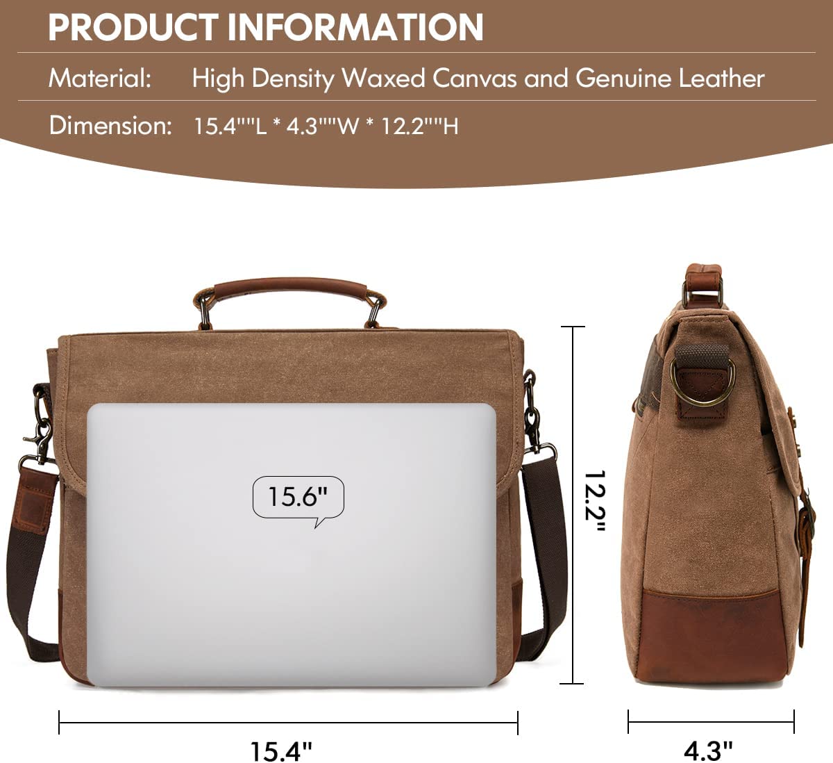 STUDRY & WATERPROOF: The mens messenger bag is presented in high density waxed canvas and genuine leather, crafted with quality solid hardware, durable and functional. Every scrape on surface create a modernized vintage look. The briefcase's dimension is 15.4""L * 4.3""W * 12.2""H, great for college, work or travel.