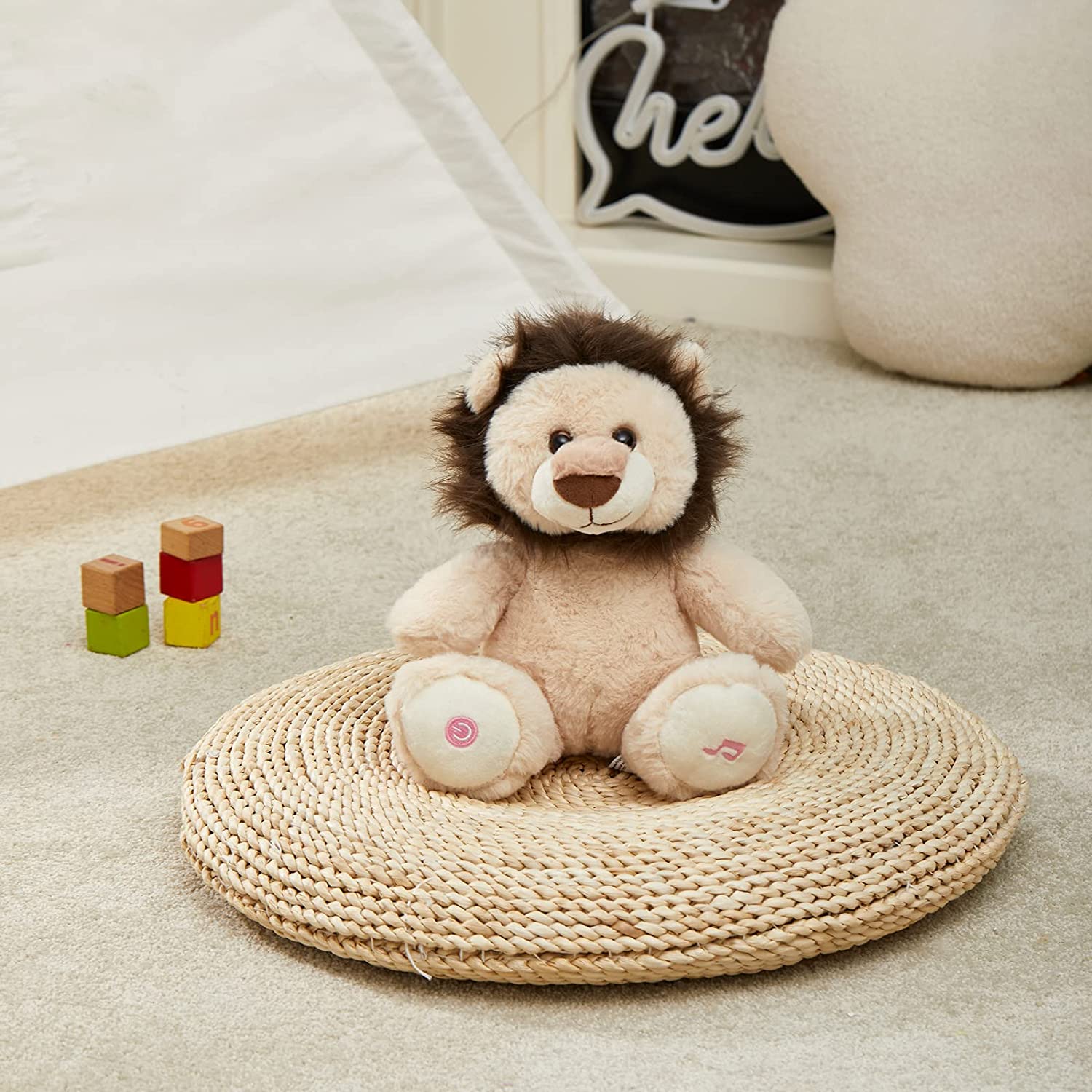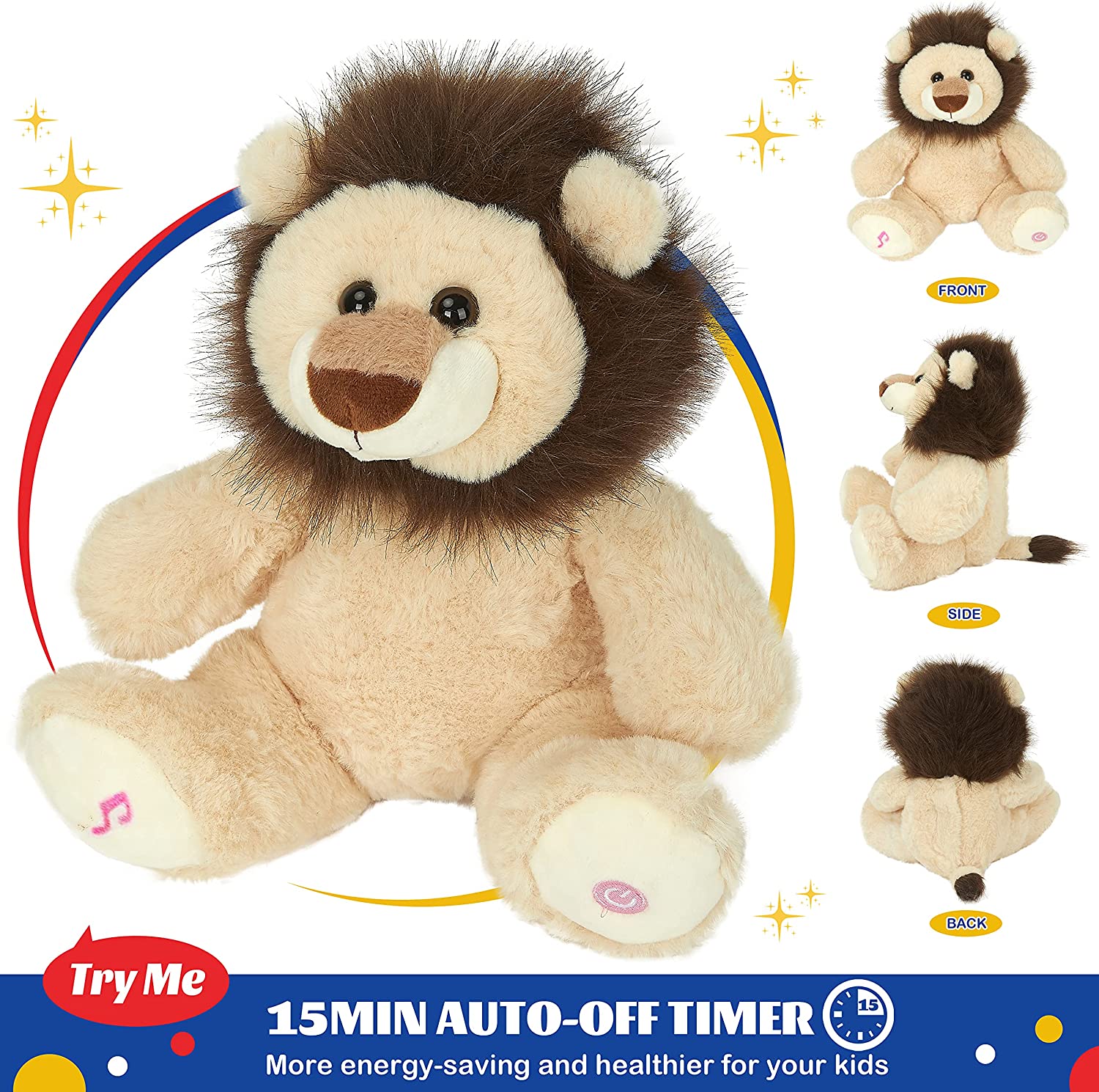 • 10 LULLABIES INSIDE-There are 10 nursery songs inside the lion stuffed animal: Mary Had a Little Lamb, Rain Rain Go Away, Twinkle Twinkle Little Star, Five Little Monkeys, Hickory Dickory Dock, The Wheels on the Bus, Do Re Mi, Fishing Fishing, If You are Happy and You Know It. All of the sings are sung by clear voice, your kids can learn to sing with the lovely friend. Play with the lion during the day and at night.