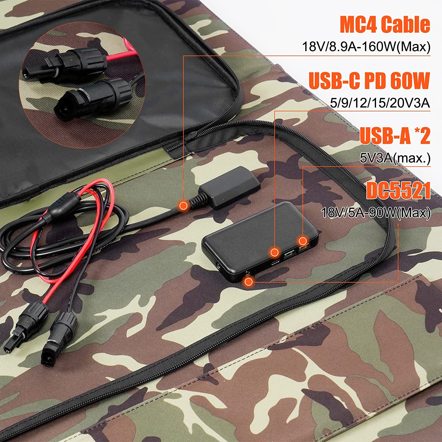 • Universal Fitment: Dual USB port(5V/2.4A per port) for charging your 5V powered gadgets, and 18V DC output(18V/3A) for charging your laptop or 12V car battery and portable generator, the junction box parallel connecting port for connecting multiple foldable solar panel.
