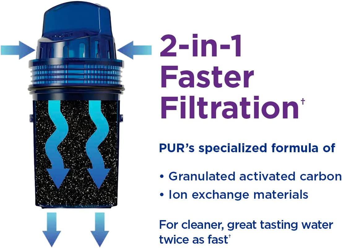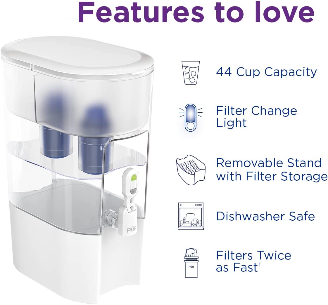 While home tap water may look clean, contaminants can get into your water through household plumbing. The PUR 44-Cup Filtered Water Dispenser offers refreshing water, quickly and easily. It’s an extra-large capacity water filter dispenser that holds up to 2.75 gallons – the largest capacity dispenser available! It includes 2 filters to last twice as long and filter twice as fast and a filter change light for replacement reminders. The elevated, space-efficient design is ideal for placing on the kitchen counter for everyday use and entertaining. Plus, the removable stand features filter storage for up to 6 extra PUR filters. PUR’s superior filter technology uses activated carbon and ion exchange media and is certified to reduce 2x more contaminants than Brita's leading pitcher filter.*ƚ Each PUR water filter is certified to reduce Mercury and certain Industrial Pollutants as well as reducing chlorine (taste and odor) and more.ƚ Using a PUR water filter system can save up to $1,000 per year on average compared with the cost of bottled water** and help keep plastic bottle waste out of landfills. Each filter is certified for up to 40 gallons. Replace your filters less often than with a single-filter system. Replace every 4 months when the filter change light turns red. Generic and private filters are not tested or certified for use in PUR filters. Genuine PUR filters are the only filters certified to reduce contaminants when used with PUR systems.ƚ Disclaimers: ƚ PUR does not filter microbes *Versus best-selling Brita® pitcher filter OB03. Brita® is a trademark of Brita LP. **Based on comparing a year's worth of bottled water (16.9 oz) to a PUR Dispenser a year's worth of 9 refills. Based on Nielsen US Scantrack sales.