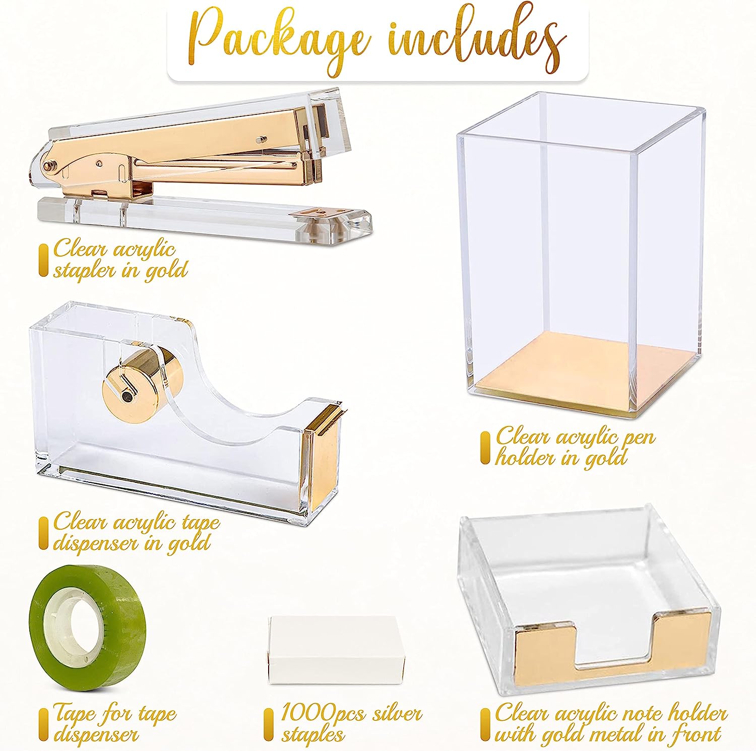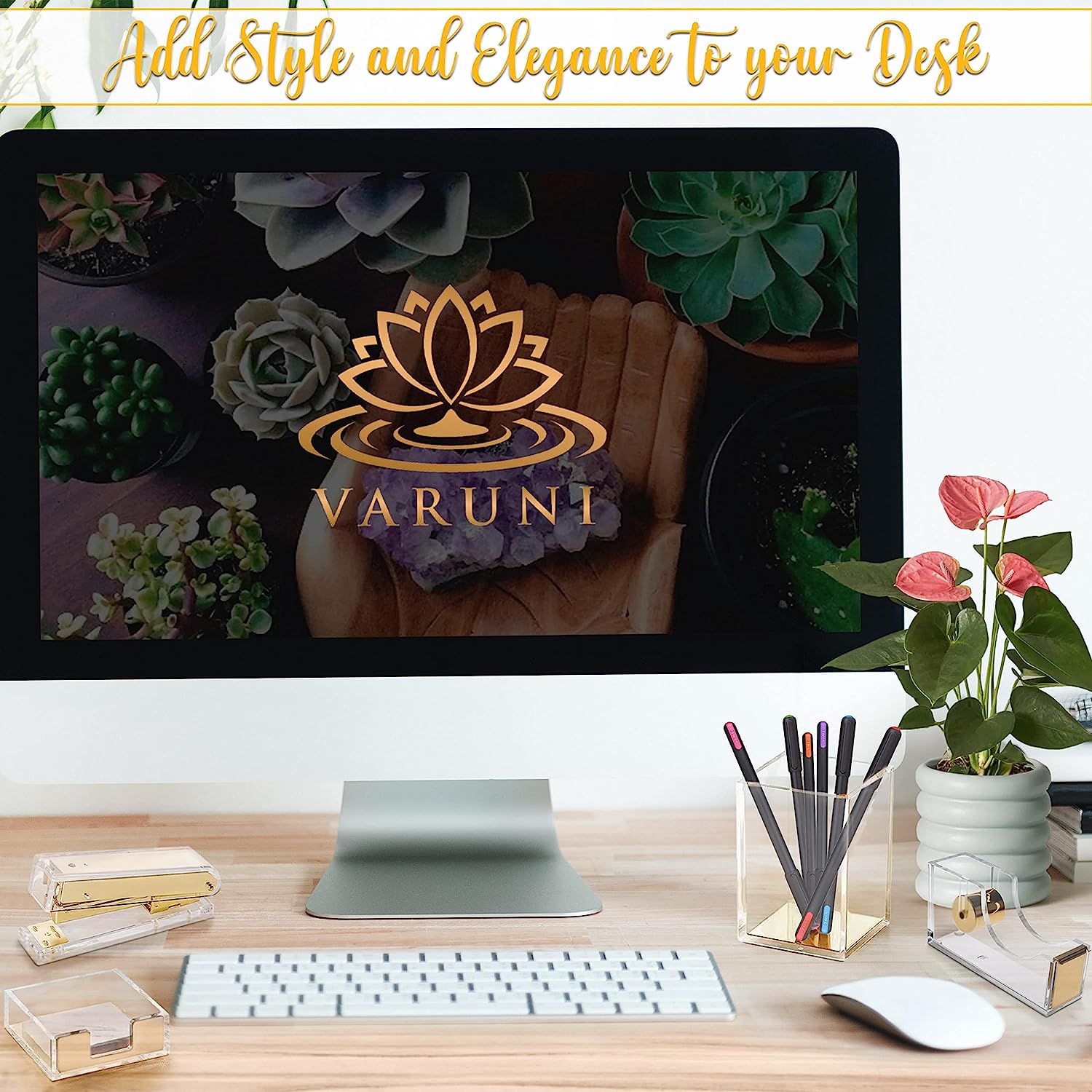 Varuni- Gold Desk Accessories- Office Accessories -Gift Set- Heavy Duty Stapler, Pen Organizer, Tape Dispenser Desk, Clear Sticky Notes- Including Clear Tape and 1000 Staples- Acrylic Desk