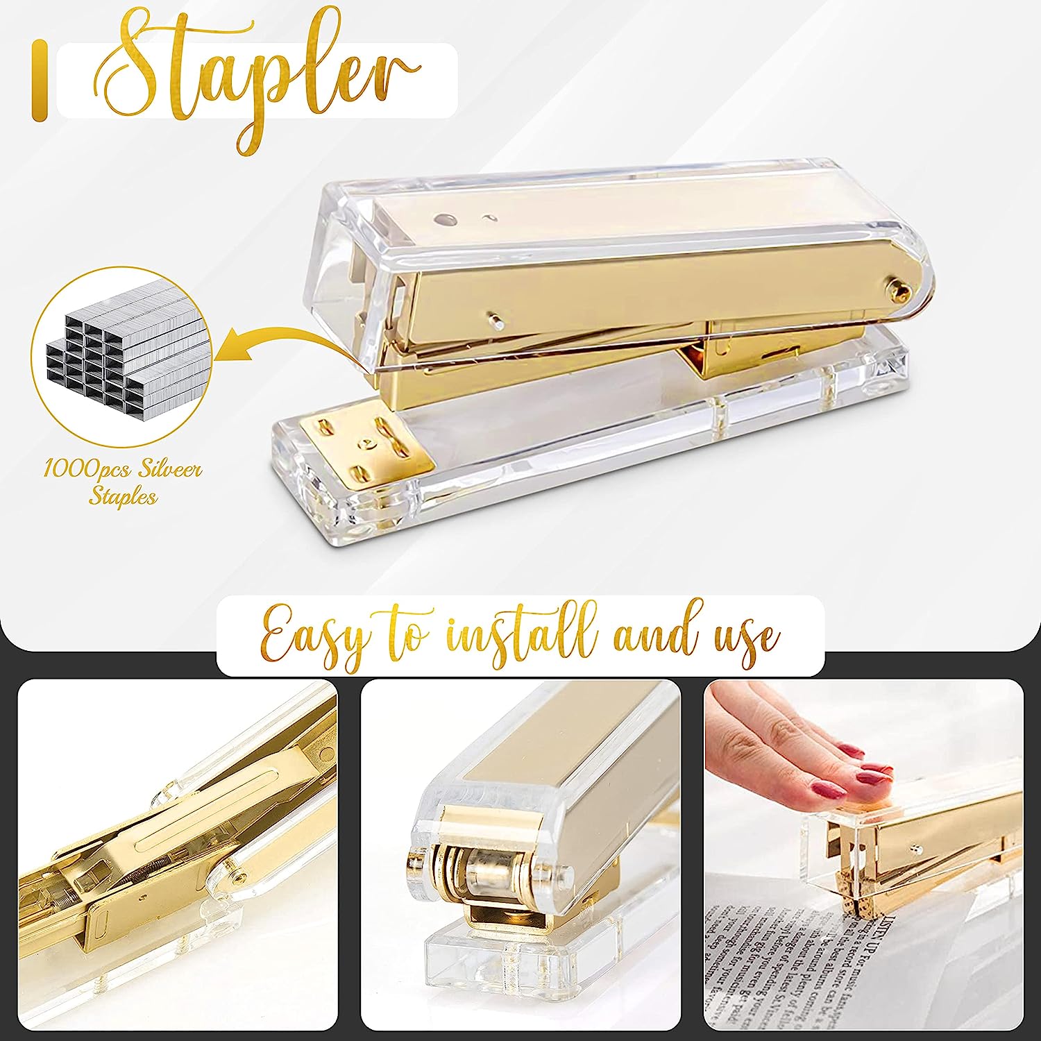 • Superior Function: Our solid interior, jam-free stapler with easy top-loading system can staple 20 pages effortlessly- Our tape dispenser has a high quality sharp sawtooth blade which enables you to tear the tape with ease It weighs enough allowing for single hand dispensing which helps elevate your work effectively these acrylic desk organizer and office essentials feature four anti skid silicone feet at the bottom excluding our pen cup which has a cork bottom