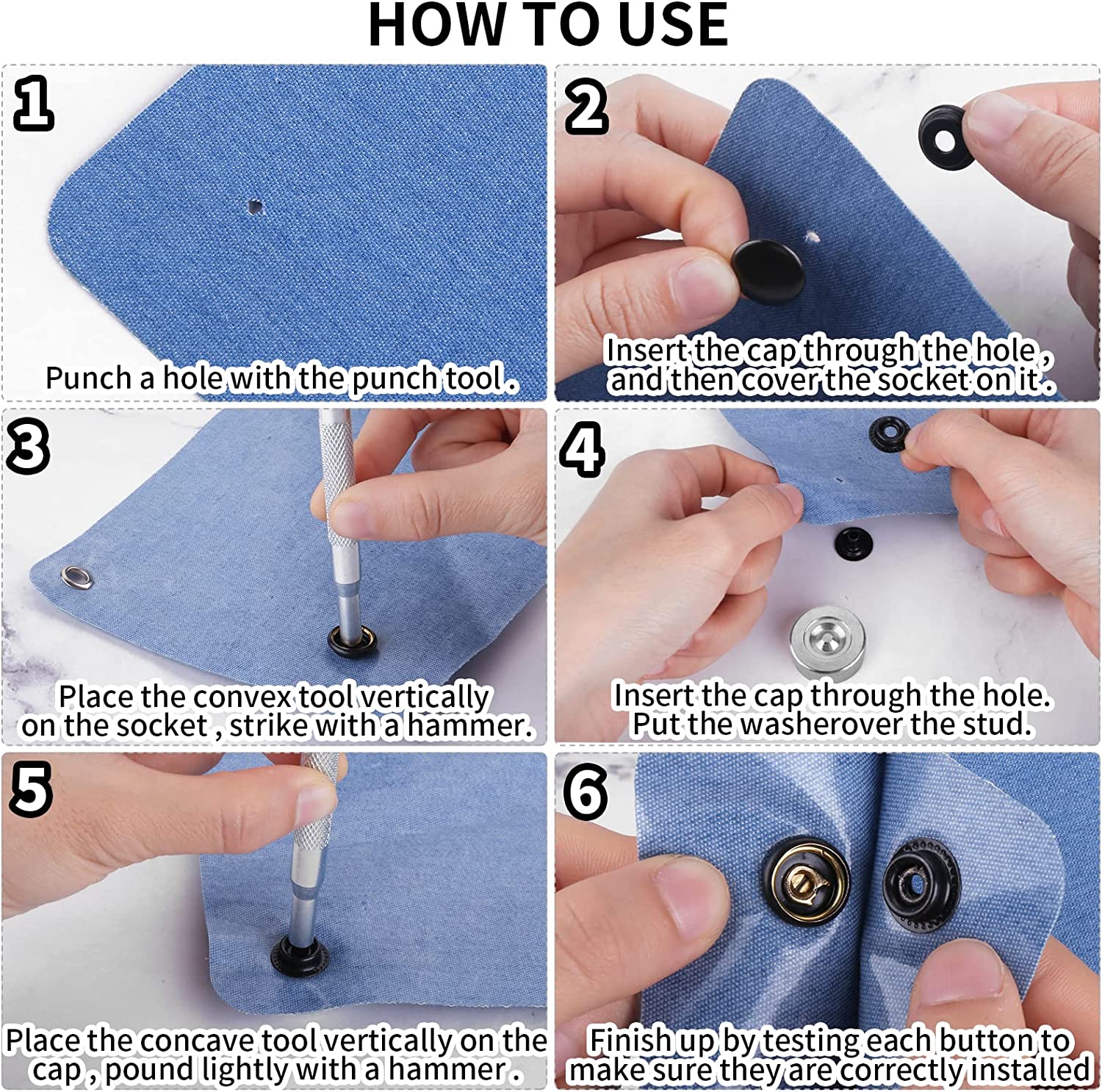 Precautions:Please be careful when using, do not use excessive force to cause deformation. Not suitable for use with thicker or denser fabrics or silk. If you have any questions about the Snap Fastener Kit Tool, please contact us via Amazon, and we will reply to you within 24 hours.
