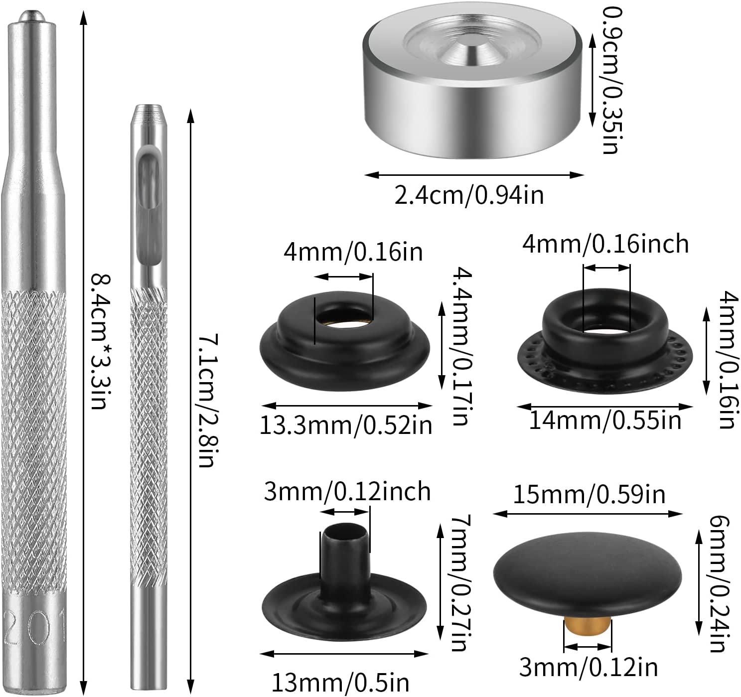 Easy to Use: This metal snap button kit is very easy to install and use, familiar with 4 installation and punching tools, and beginners can easily learn to use it. Size details are shown in the picture