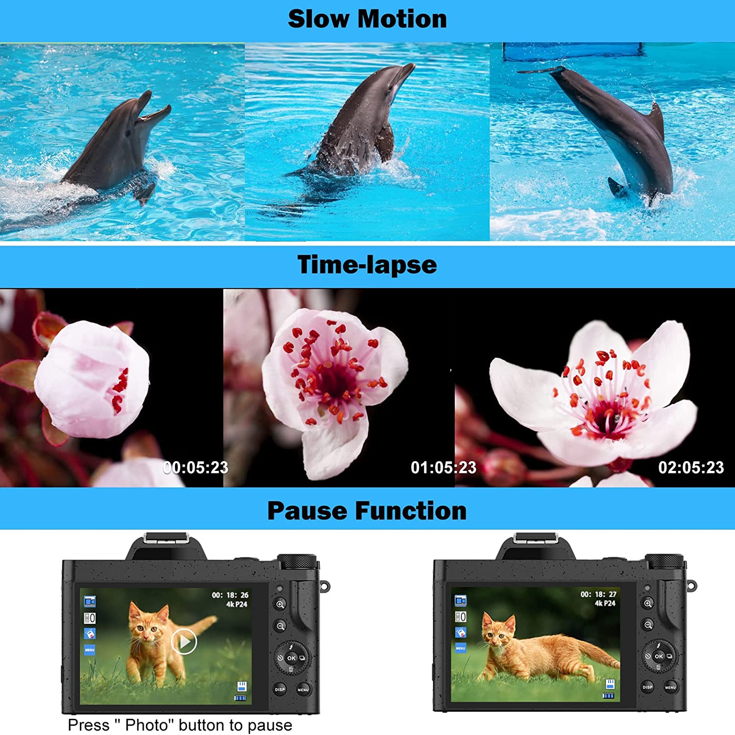 【Webcam & HDMI Output & Pause Function】 Video camera can be used as a webcam, you can have video calls or start live streaming to share things on social media. you can connect this camcorder to the TV via a HDMI cable to playback the photos and videos. (HDMI Cable Included). The 4k digital camera have an excellent pause function which allows you to continue recording in the same File without restarting a new one.