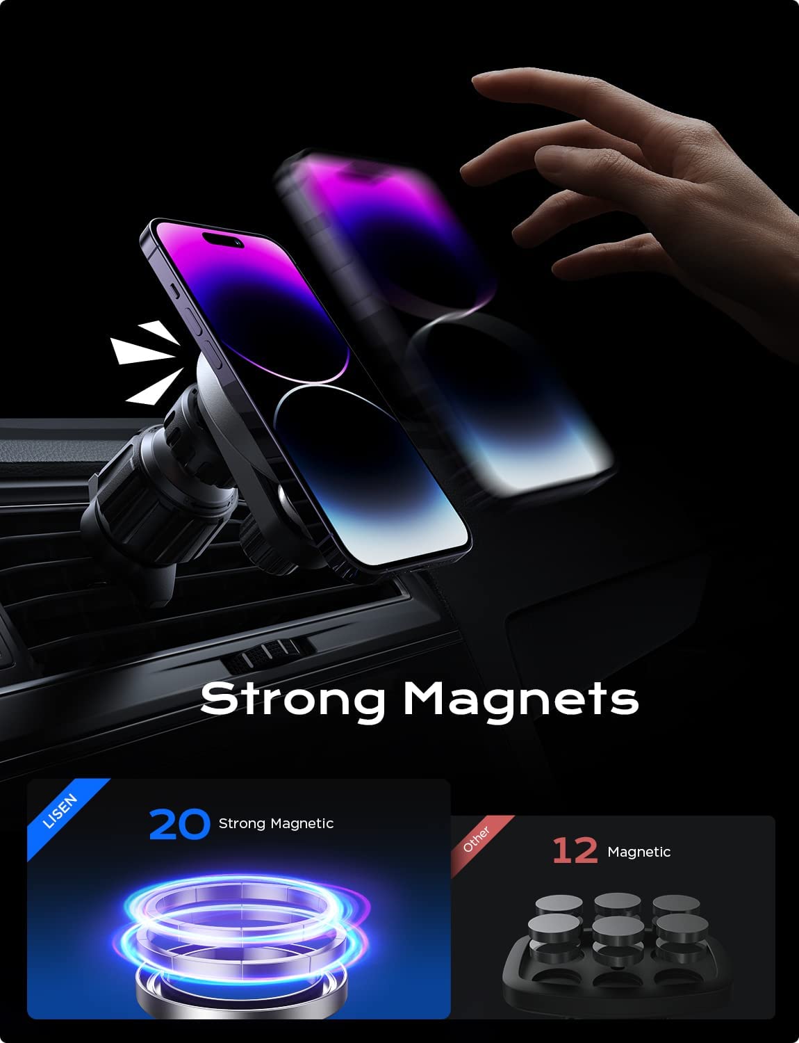 ?More Stable, Less Blocking: LISEN brand laboratory has upgraded this magsafe car vent mount from 3 directions.①Upgrade extension arm to protect your phone overheating crash; ②Cell phone holder for car mount with most stable "Steel Hook";③Magnetic phone car mount that has the strongest magnet force, which can hold up to 10 iPhone 14 Pro Max. LISEN provides at least 1 years of user service