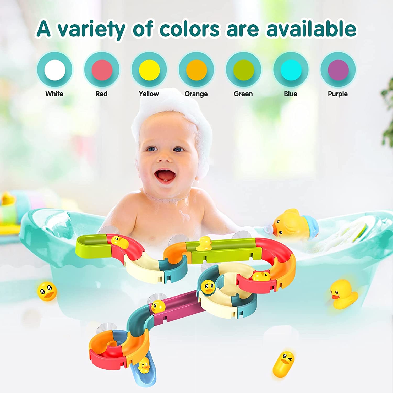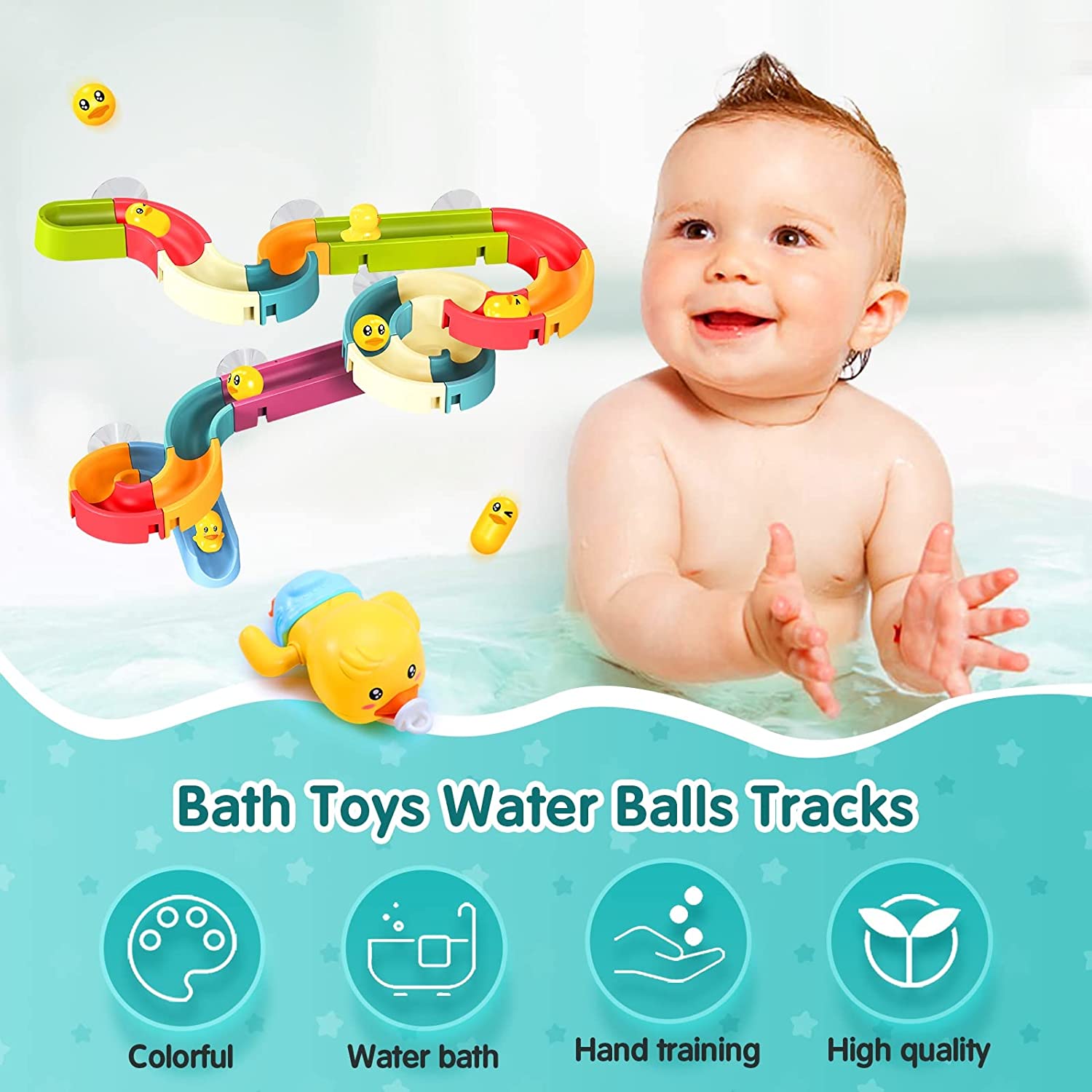 【Fun Bath Toy Track Game】This bathtub bath water track toy contains a total of 35 bath accessories, 20 * colored track pieces (random colors), 8 * suction cups, 1 * wind-up bath duck, 6 * mini duck toys. Kids can create a fun DIY bath toys, our baby bathtub toys provide all-round protection for your child, it is an excellent toy for your little one. Bath time becomes more enjoyable and faster!