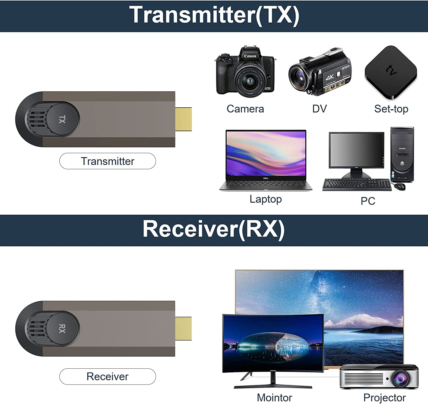 - [Plug & Play] No need any APP, simple connection can get the convenience of wireless streaming media.No software or WiFi connection required. Get up and running in 20 second with a true plug-and-play experience.which solves the problems for the traditional HDMI cable connection and wiring trouble, aesthetics affecting and the short transmission distance. Connect the transmitter to the HDMI source, then connect the receiver to the HDTV/Projector , connect the power, and you are ready to go.