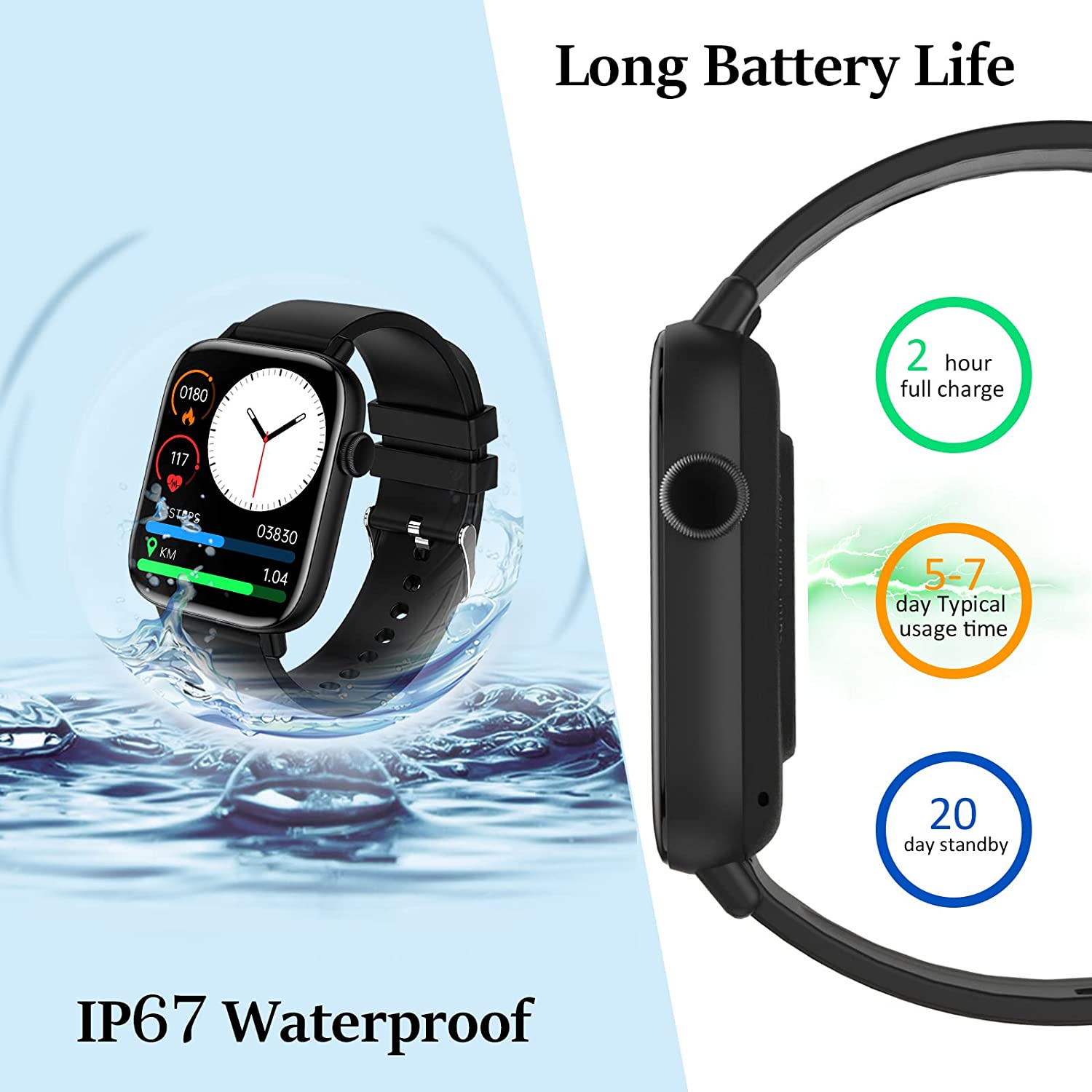 • ?【Smart Watch with Text and Call】Smart watches for men women allows you to answer or dial Bluetooth calls anywhere, anytime. And it will vibrate to remind you when your phone receives the messages or App notifications (SMS, Fbook, WhatsApp, Twitter, Instagram, Gmail, etc). Never miss any important notification.2 hours of full charging, 5 - 7 days of continuous use, and 30 days of standby.Note: Only support reading some App messages, can't send messages.