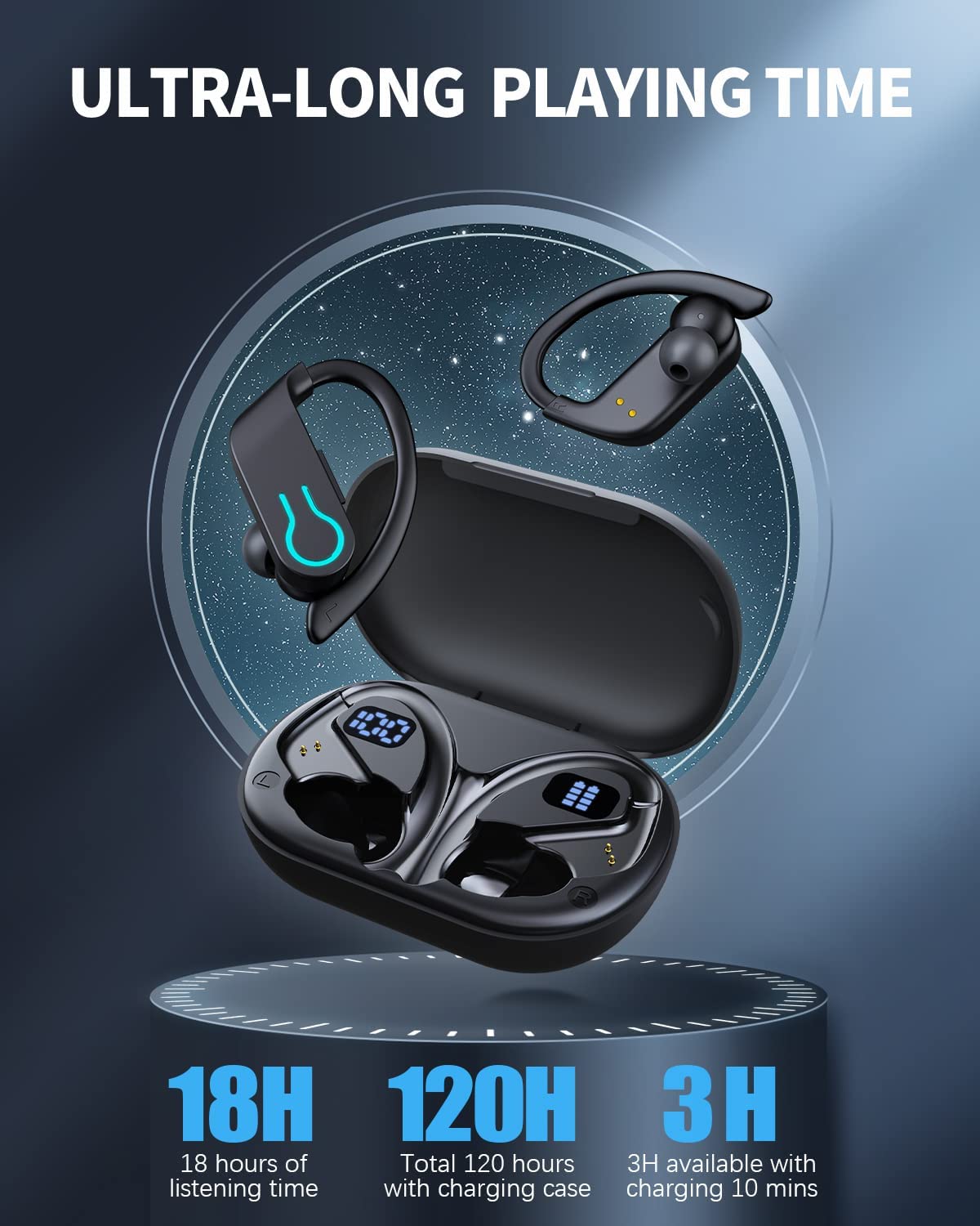 • ?【120H Playback and LED Digital Display】Single wireless earbuds can be use 18Hrs, up to 120Hrs of listening time with 9 additional charges from 950mAh battery capacity charging case. Charging case with a clear digital display, as well as the left and right sides with the earbuds power display, each grid represents 25% of the power. During charging and connected, the LED light will flash.