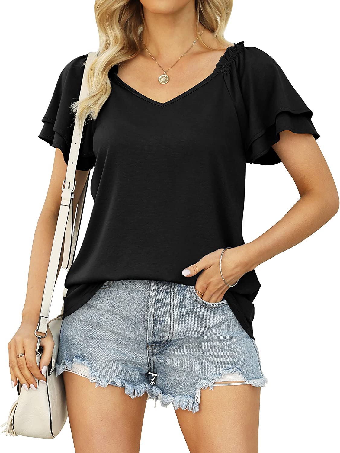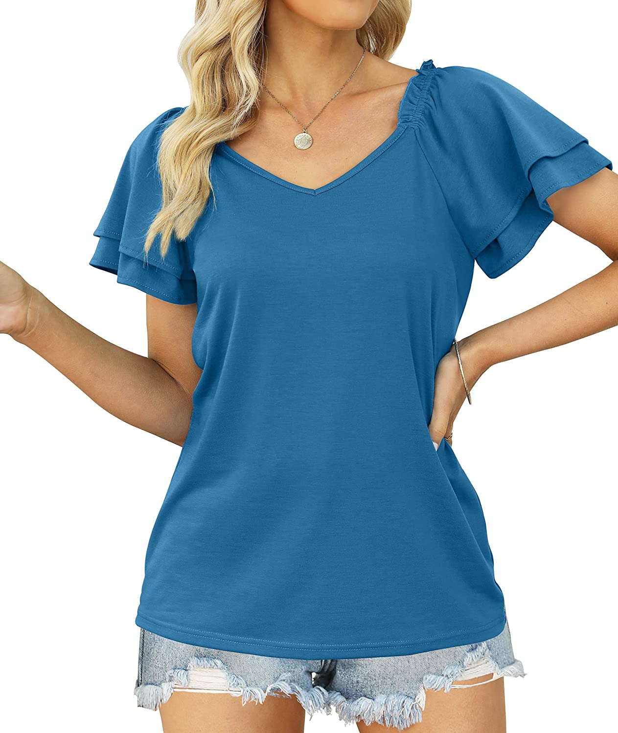 • Feature:Cute Summer Tops for Women. Dual Layer Flounces Sleeves, Smocked Shirred, V Neck, Ruffle Sleeve, Loose Fit, Super Stylish!