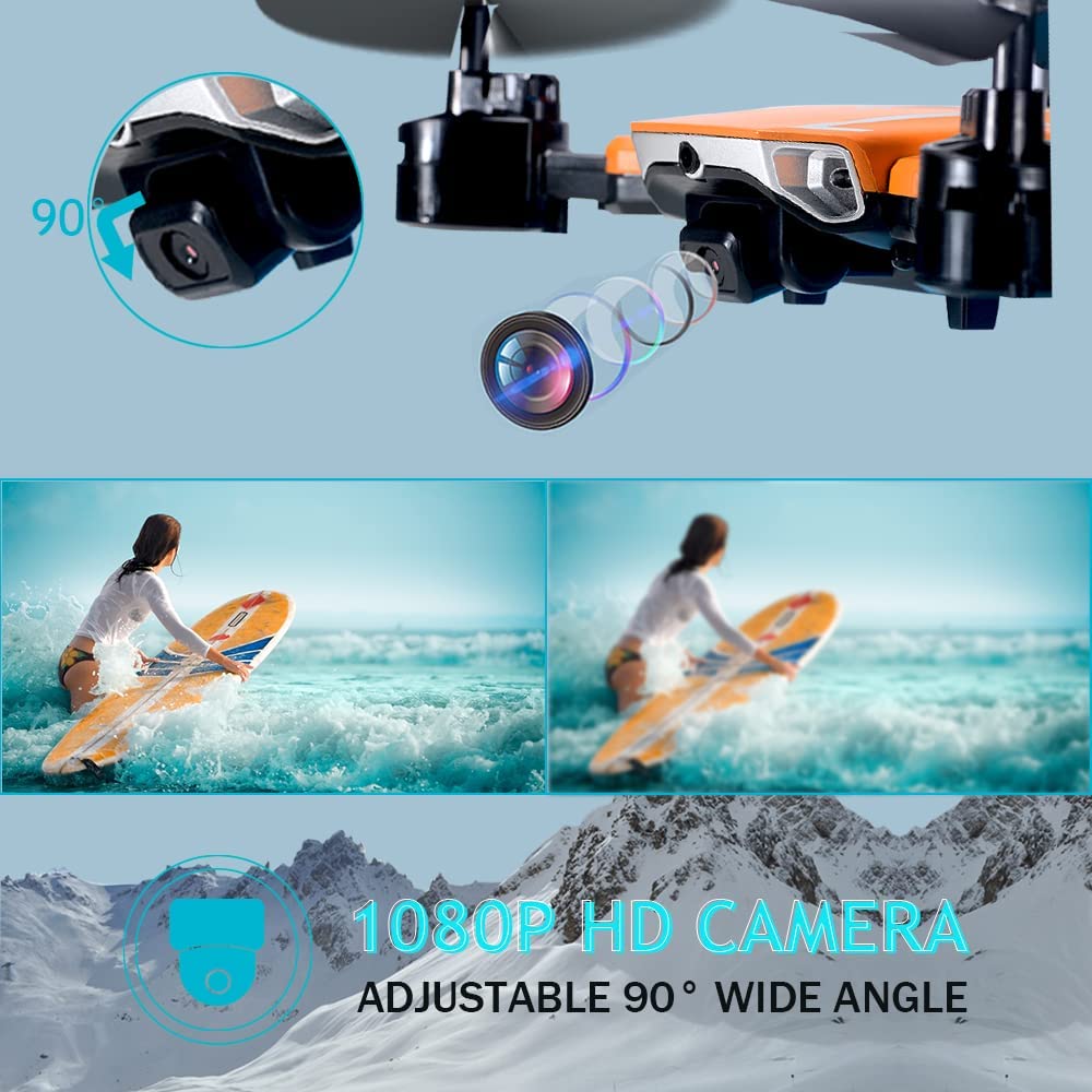 • ✈[ Drone with TWO Cameras] Our mini FPV drone equipped with TWO 1080P HD cameras that can be adjusted within 90° by your remote control or the app, 2.4G Real-Time transmission can give you a smooth and stabilized live video, assist you catch every exciting experience and wonderfully moment from the 120° wide-angle lens