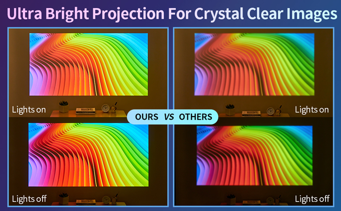 • ?【Native 1080P, 15000L & 550 ANSI Lumens, 4K supported】 2023 upgraded WiFi projector, using the original physical resolution of 1920x1080, has 3 layers of refractive glass lenses. Compared to our competitors who use single layer lenses, we use multi-layer refractive glass lense technology to reduce projecting blurry edges on screen. Its display is calculated to render sharper resolution to the full screen. It has 550 ANSI lumens, much brighter and more colorful than other 1080p projectors.