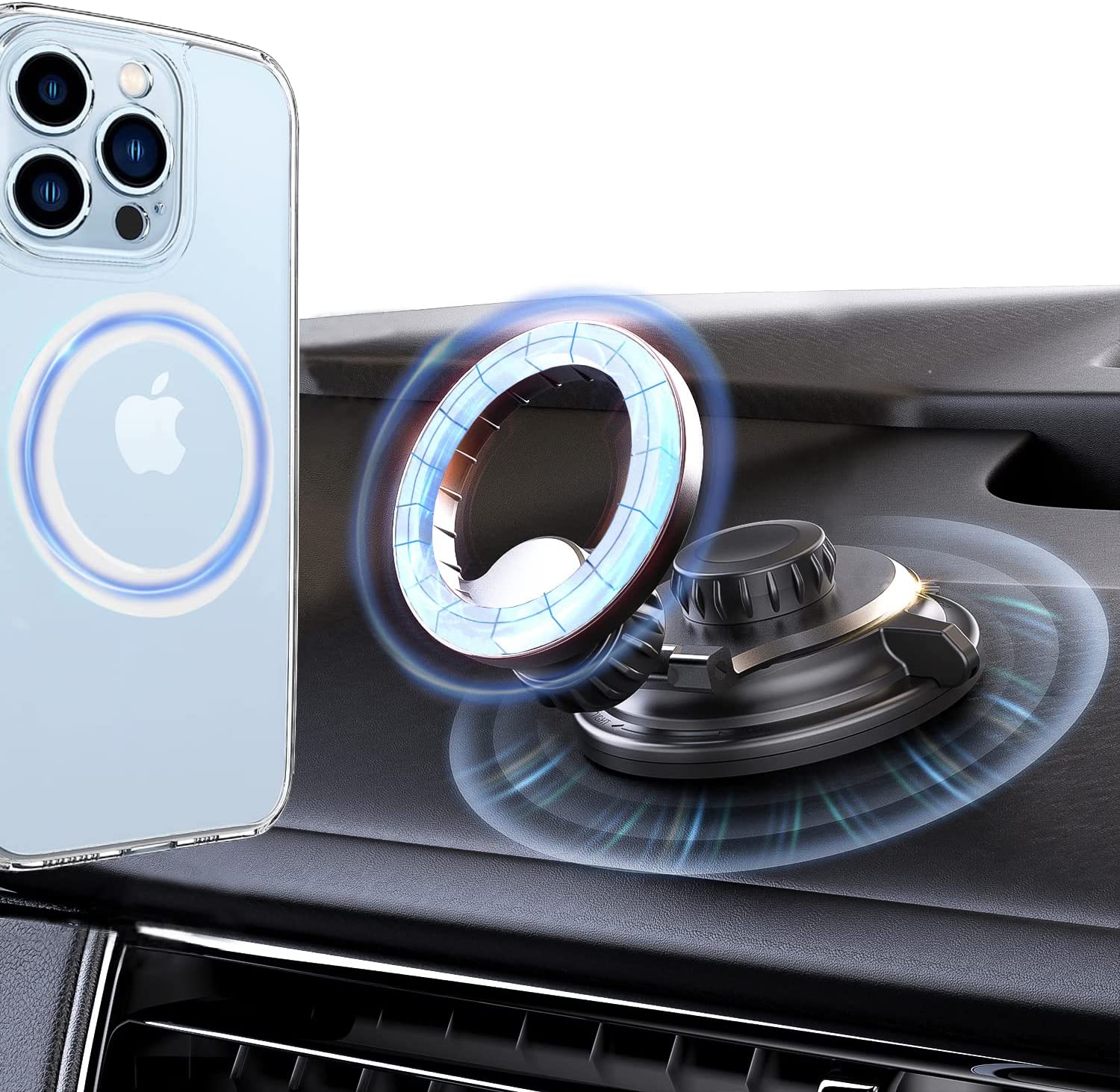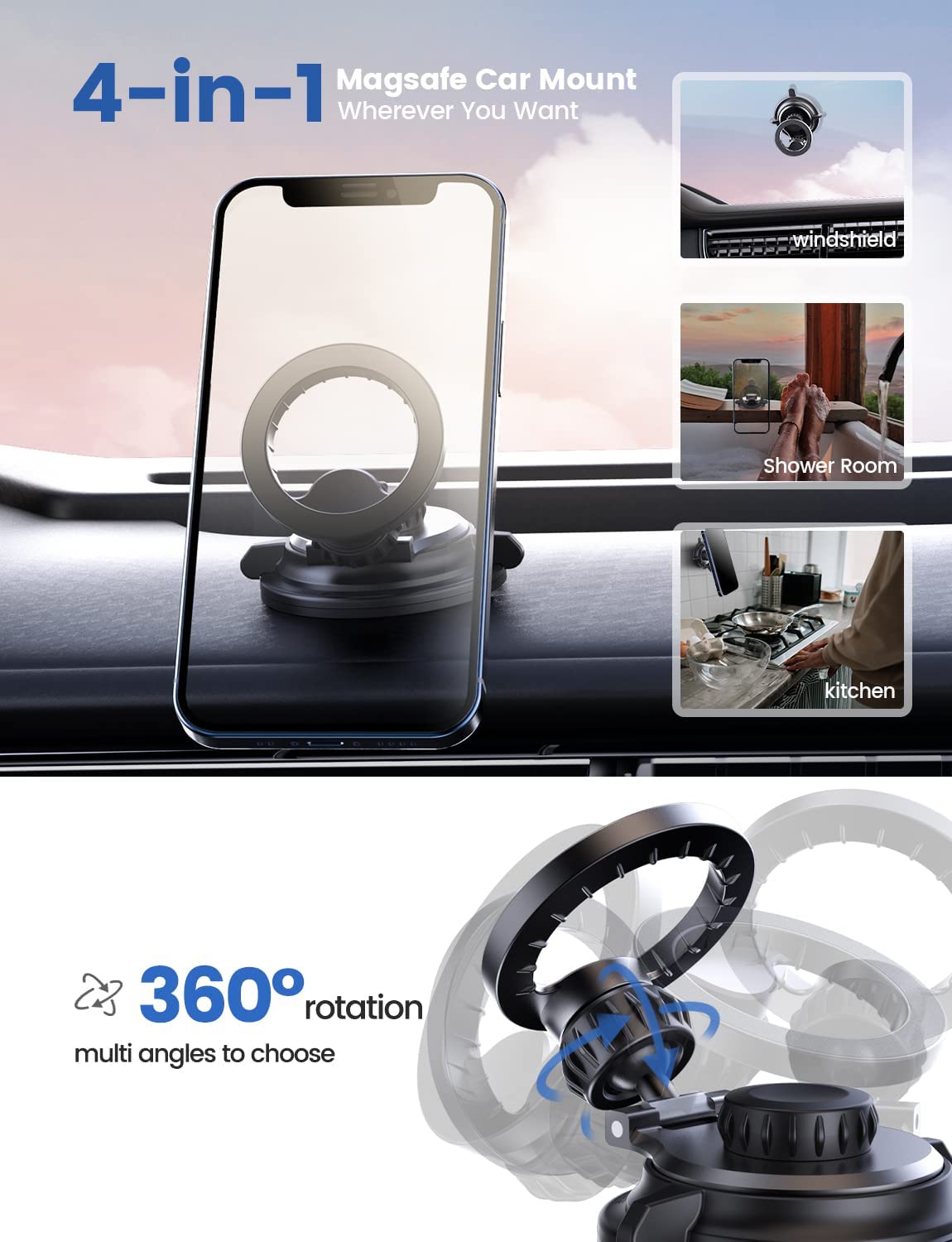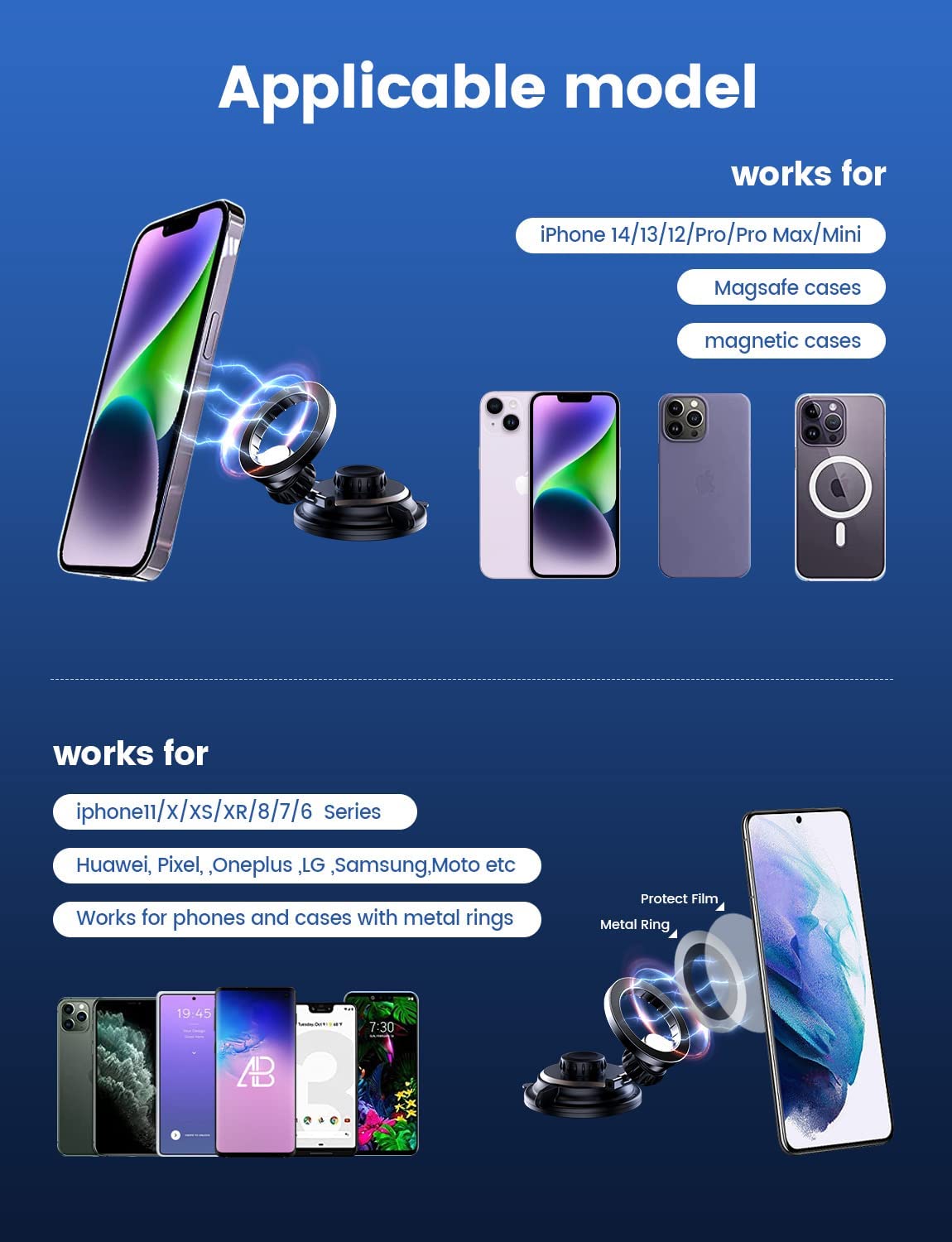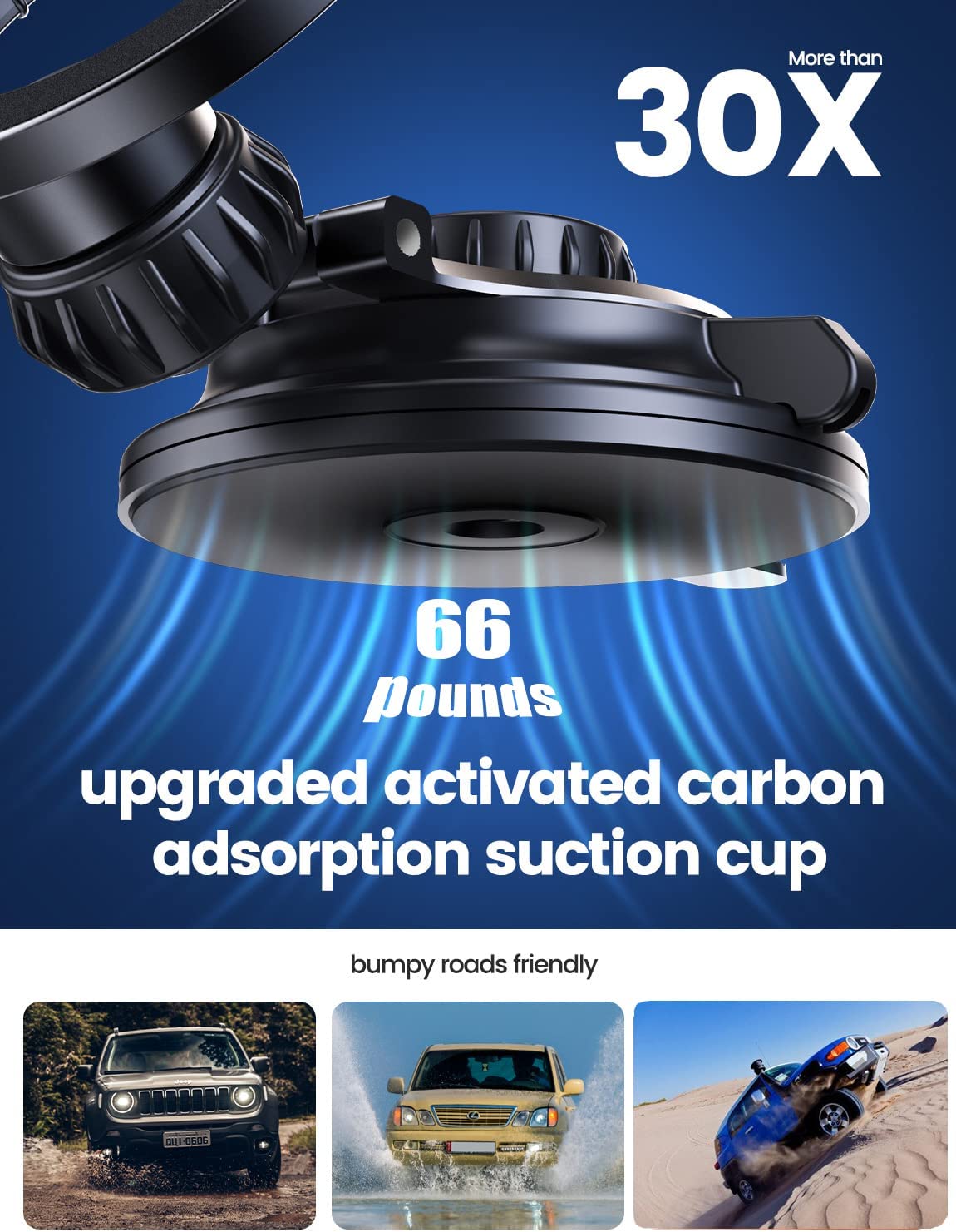 • ??[Fit iphone 14 magnetic car mount with Super Carbon Suction Cup ] Newest upgraded activated carbon adsorption suction cup rotates to form a firm vacuum space, up to a few dozens pounds of suction power firmly adsorbed on the dashboard /wall/desktop, 30X stronger than ordinary suction cups. Make sure your phone is stable as a rock even going through rough and bumpy roads