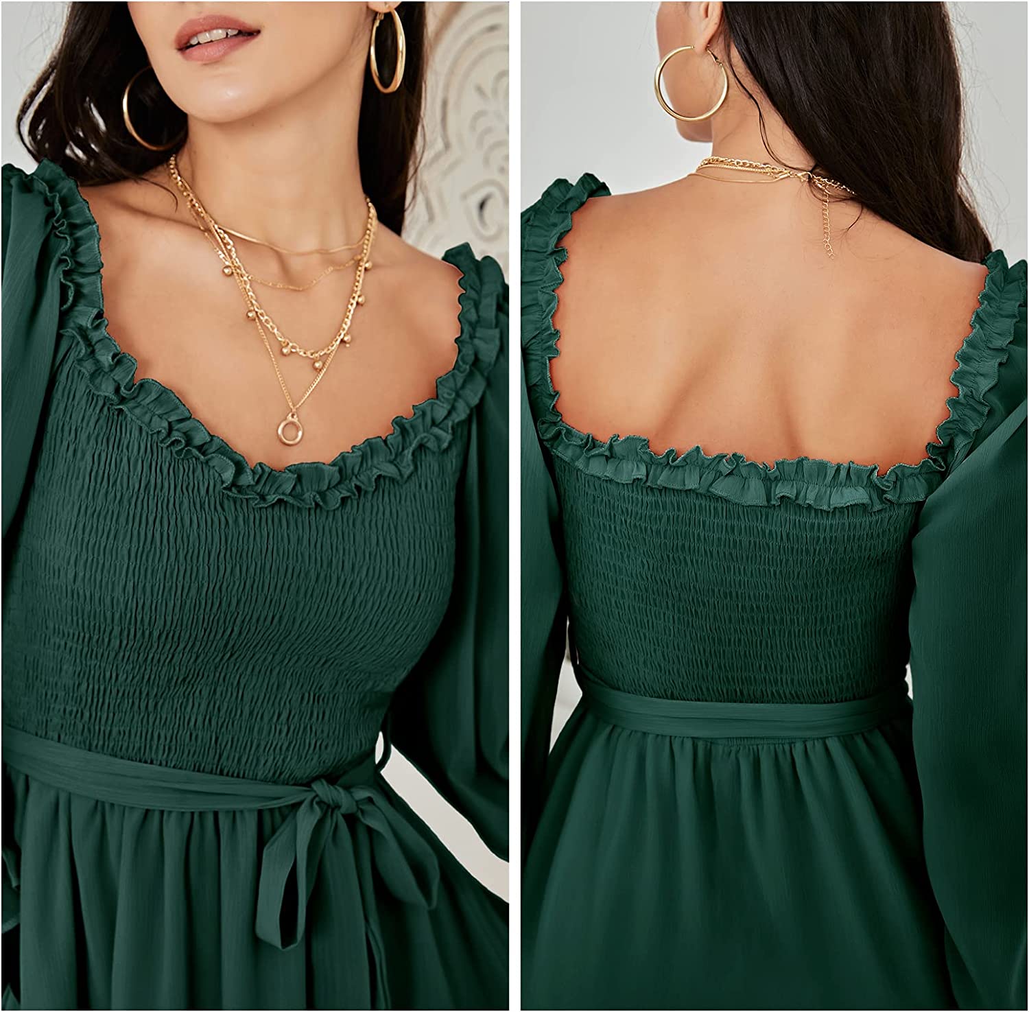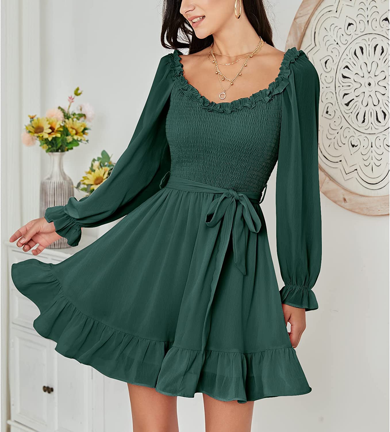 • Feature: long sleeve, ruffle V-neck, off-the-shoulder, smocked bodice, mini dress, waist tie, flowy swing skirt, hight wasit,ruffle hem, prefect for teens wear,go toanywhere like cocktail, party, date night in spring.