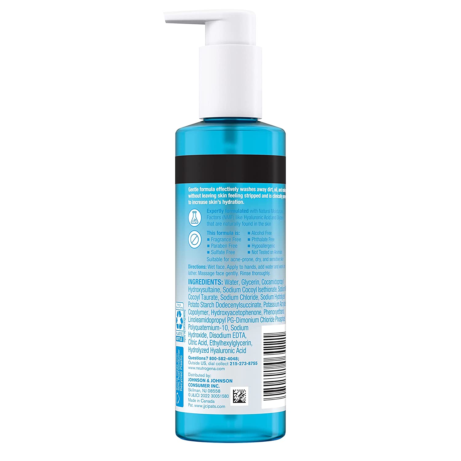 Gently and thoroughly cleanse skin while boosting hydration with Neutrogena Hydro Boost Fragrance--Free Hydrating Facial Gel Cleanser. This foaming facial cleanser from a dermatologist-recommended brand transforms into a silky lather that removes dirt, oil, makeup, and impurities while leaving skin soft and supple. Clinically proven to increase skin's hydration level and lock it in, the face wash respects skin's moisture barrier with BarrierCare Technology and contains hyaluronic acid, an essential, dermatologist-recognized hydrator found naturally in skin. The gentle, lightweight formula is hypoallergenic, non-comedogenic, fragrance-free, oil-free, soap-free, paraben-free, dye-free, phthalate-free, and alcohol-free. An ideal addition to your skincare routine, the hydrating daily cleanser lathers easily and rinses clean. For increased hydration, use with other products in Neutrogena's Hydro Boost line.