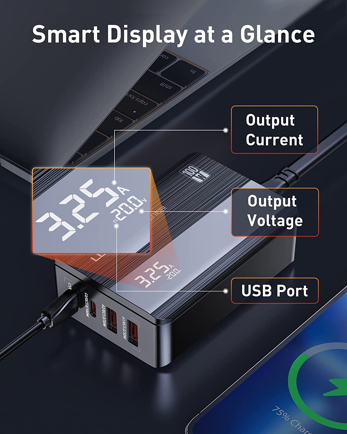 • 【100W PD Fast Charging & LED Display】LDNIO USB C charger has a high-speed output of 100W Max and has an LED display that shows amperage and voltage in real-time to help you clearly check the charging status. The single USB-C port supports 100W Max output, and the USB-A port supports 30W Max output. Fully charge a 16" MacBook Pro in just 1.8 hours or charge an iPhone 14 Pro to 50% in 30 minutes, 3X faster than the original 5W charger.
