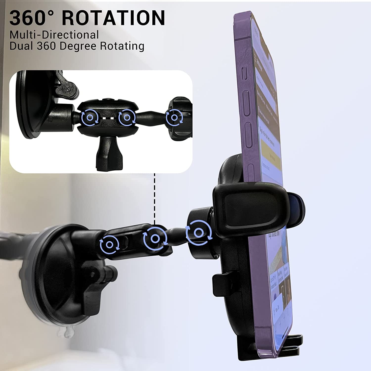 • 【Reliable & Secure】The powerful suction cup phone mount can mount your phone to any smooth wall or surface, such as mirror, tile, bathtub, glass, airplane table, gym equipment,Dashboard,Windshield etc.