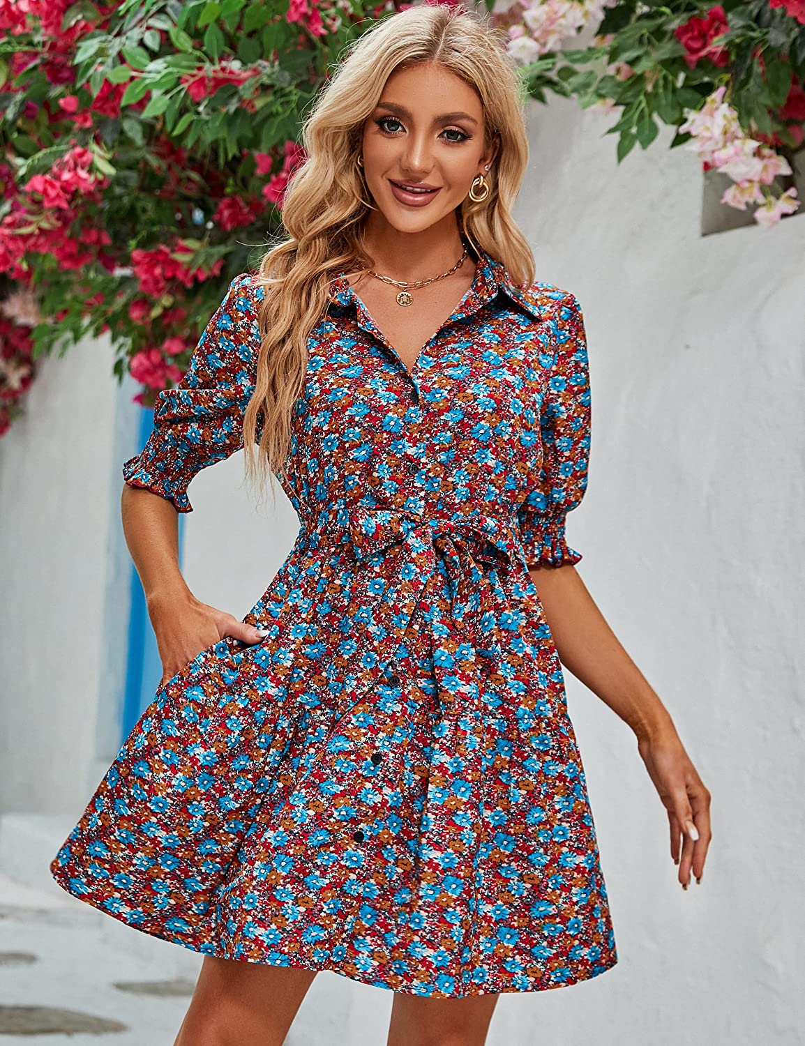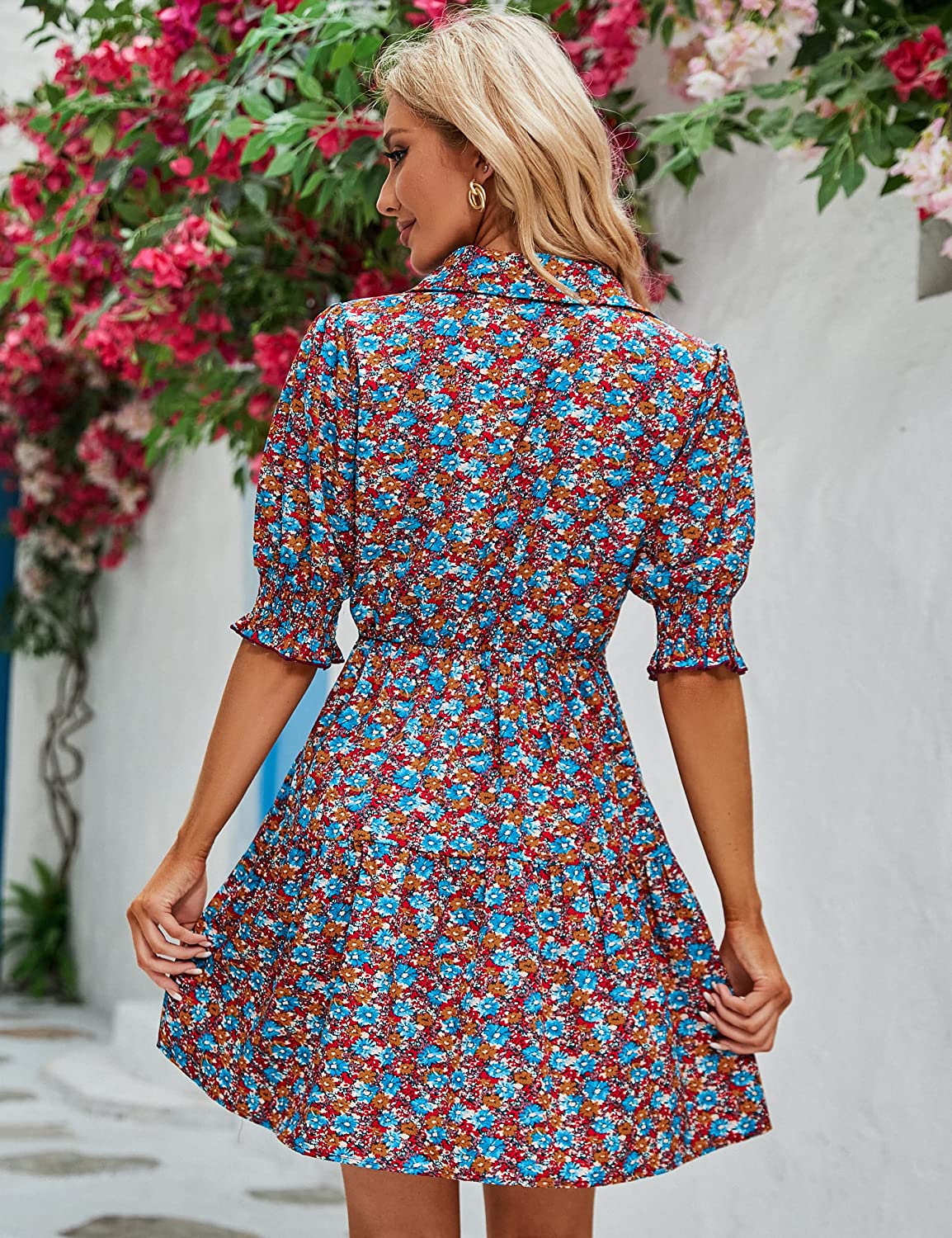 Feature: Womens summer dresses feature square neck, puff short sleeve with elastic cuffs which also can be sexy off shoulder, stretchy smocked bust design, elastic empire waist with cute ruffle, tie open back, 2 pockets, floral print, above knee length, a line baby doll silhouette, releaxed fit.