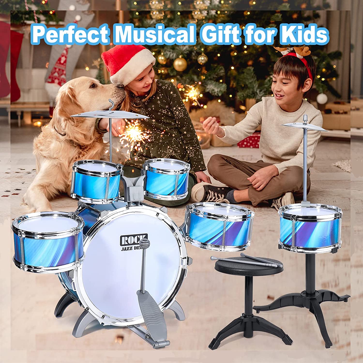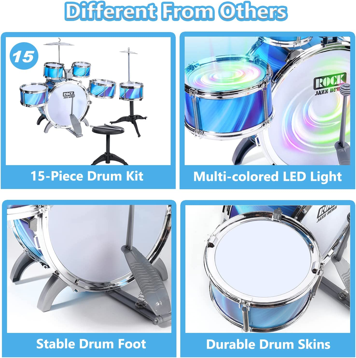 Kids Jazz Drum Set for Toddlers 1-3 (15-Piece), Drum Kit Musical Instrument for Beginner Music Practice w/ 4 Lights, 6 Drums, 2 Cymbals, 2 Drumsticks, Stool (Blue)