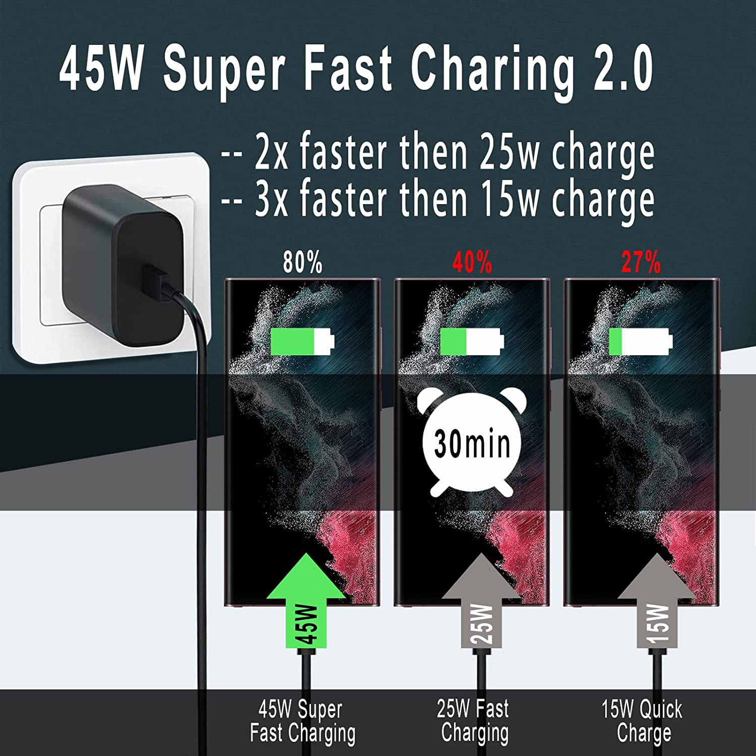 ⚡ 45W Samsung Fast Charger : This 45 watt samsung type c fast charger contains PD3.0 and PPS2.O fast charge technology which apply to samsung devices. It is 3x faster than 15W adapter and 2x faster than 25W wall charger. The PPS allows the speed from 3.3V to 20V according to your device's charging condition with maximum power and safety.