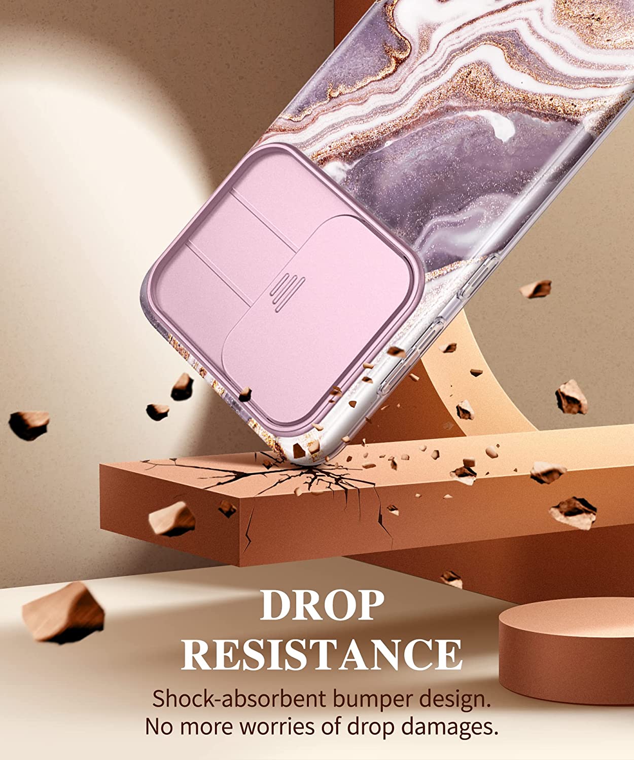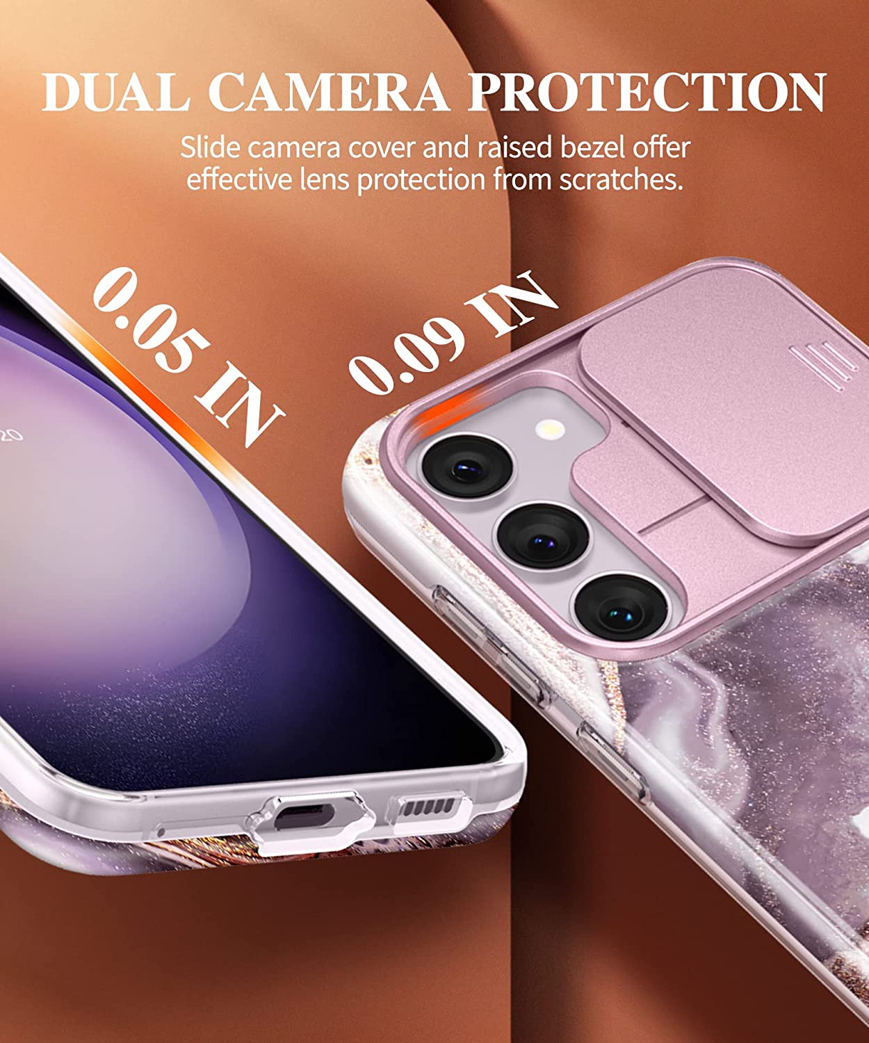 • [Upgraded Slide Camera Cover Protection] The sturdy sliding camera lens cover and raised lip around the camera, can protect your S23 Plus phone camera from scratches, collision, scuffs and impact. The fixing clips at both sides allow a firmer lock that fixes the camera protector in a certain position, won't easily become loose or slide randomly.