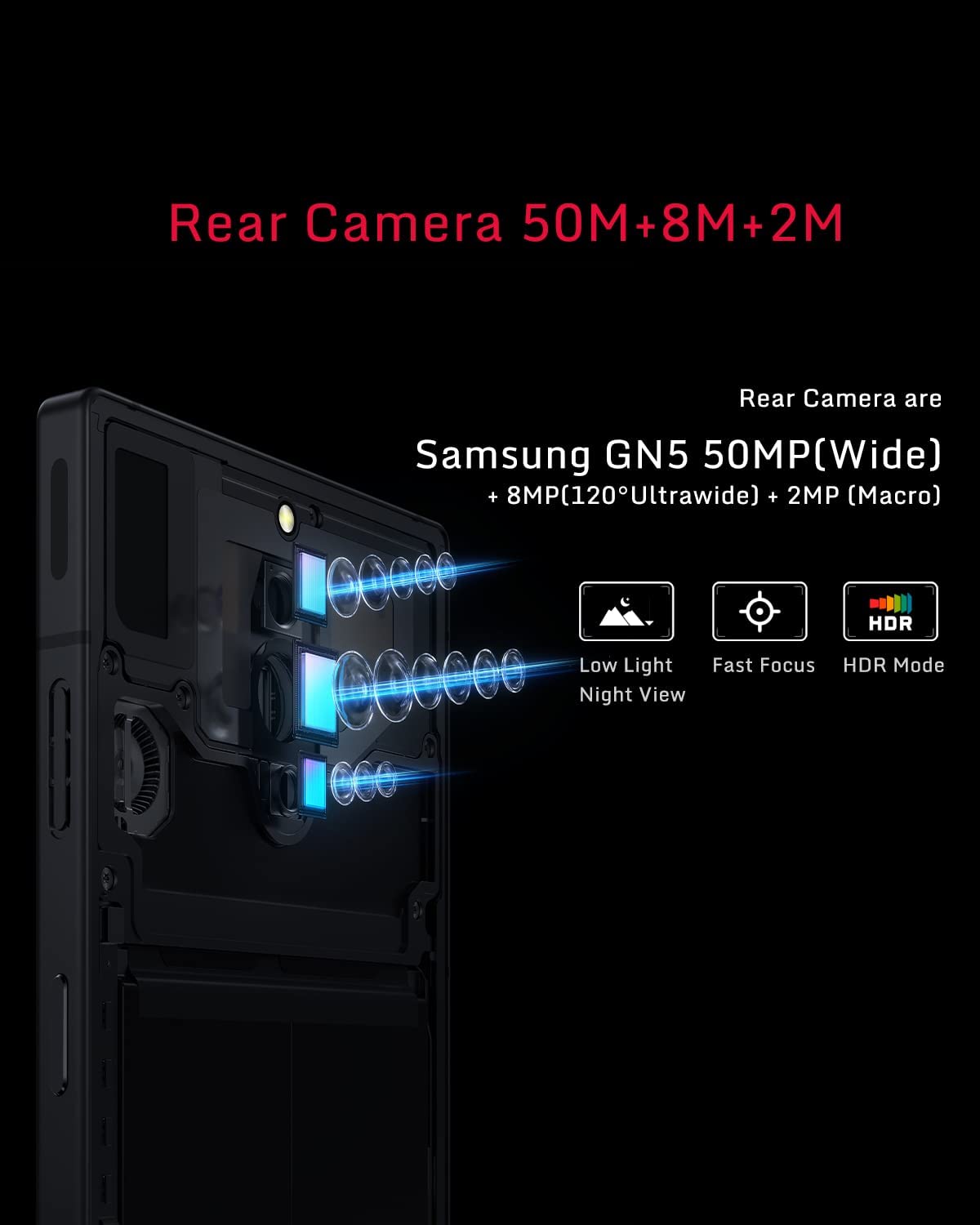 • 【Ultra HD AI Quad Camera】Rear Camera are Samsung GN5 50MP, F/1.88, (Wide)+ 8MP, F/2.2, 120˚, 13mm (Ultrawide) + 2MP, F/2.4, (Macro). The primary camera is upgraded to enable users to take fantastic photos and videos with a fast auto focus, even in the dimmest scenario. Every detail is captured. Thanks to dual pixel focusing, it ensures fast autofocus regardless. Front Camera is 16 Megapixel and 2nd generation under-display-camera (UDC).