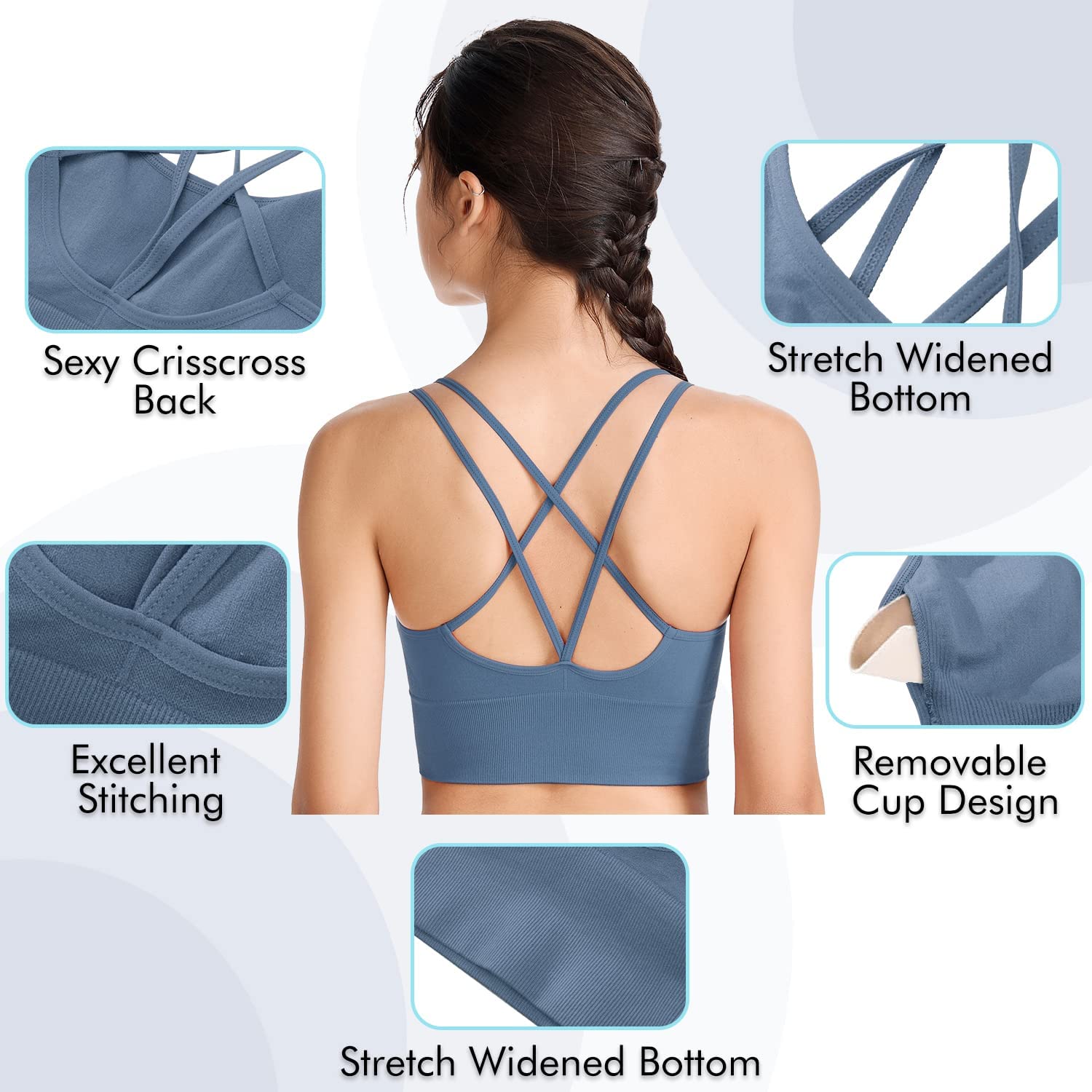 • ✔Cute Crisscross Design: Our sports bras for women stylish sexy cross open back is designed to show your line of back perfectly and offers an extra back support;The widened bottom support minimizes the movement caused by shaking, prevents sagging.Stylish Strappy back helps you move with ease, protects against shock and impact, prevents the bra from shifting, don't worry about they moves.This bra is intended to provide super support for great shape retention, long-lasting comfort.